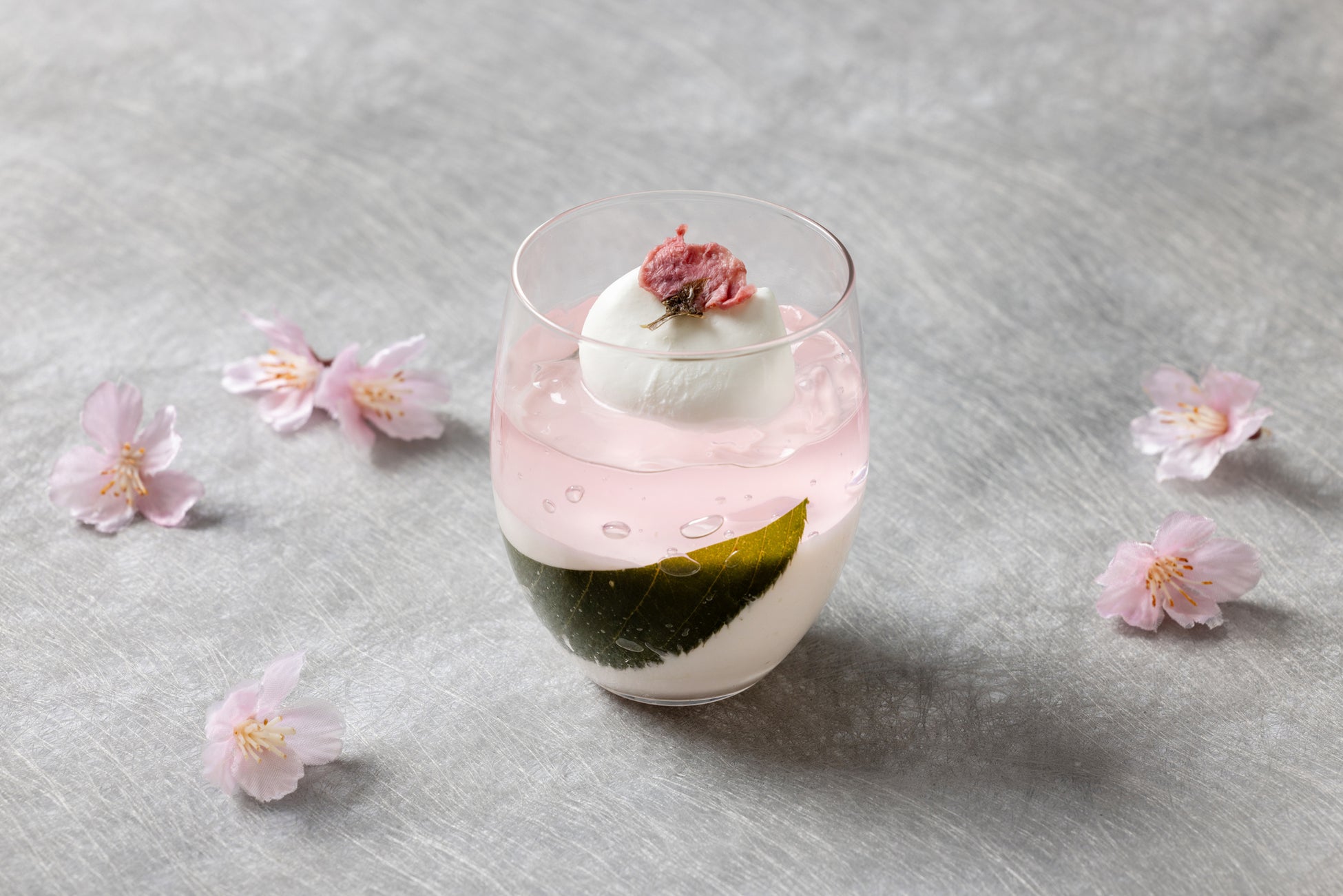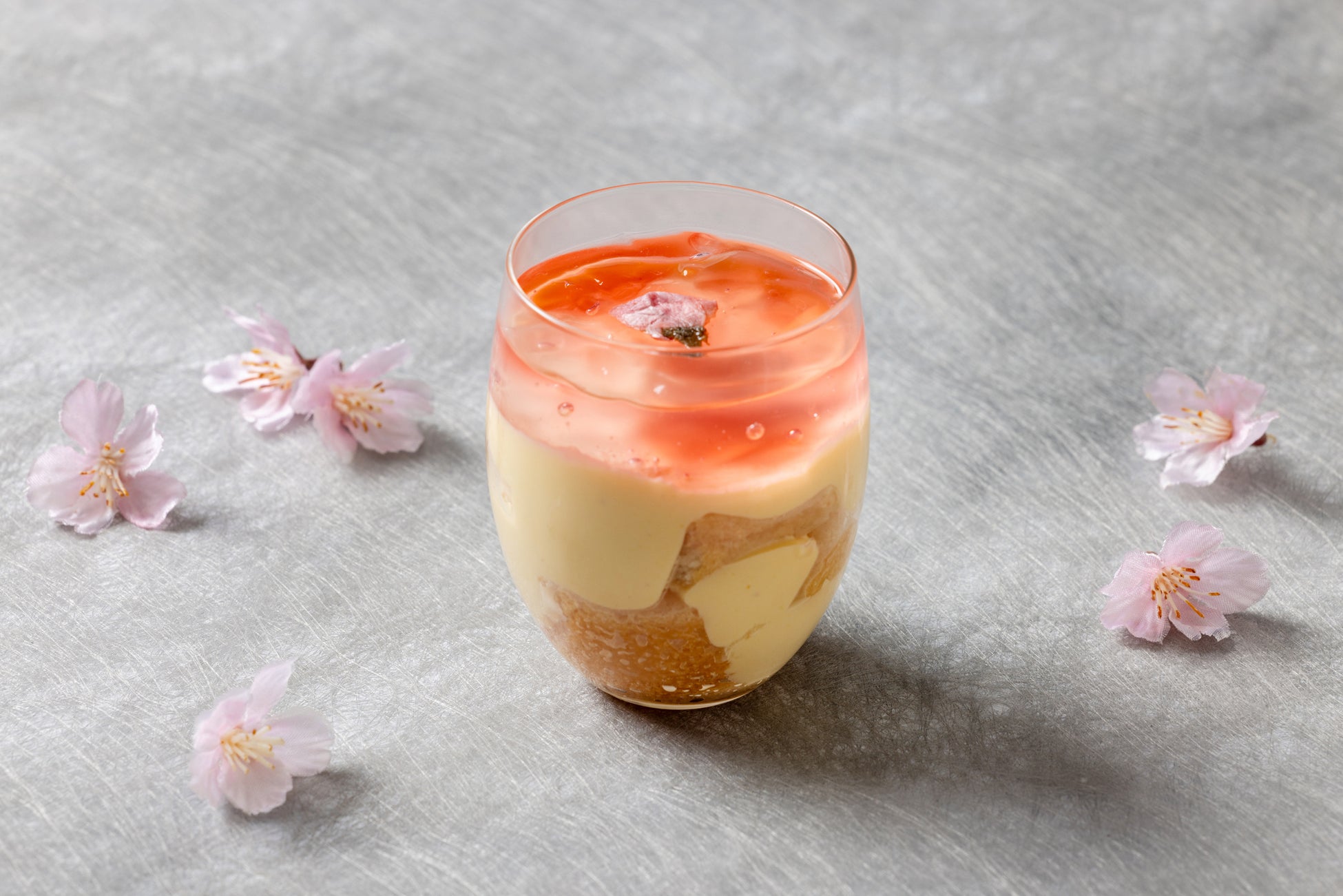 樽で熟成させた芳醇な香りが特長の甘口ワイン「マルサラ酒」で風味づけしたコクのあるマスカルポーネと、桜シロップをしみ込ませたスポンジを丁寧に重ねた濃厚かつ繊細な味わいです。淡い桜色のゼリーをトップにあしらうことで、桜色に染まりゆく季節の移ろいをグラスの中に表現いたします。