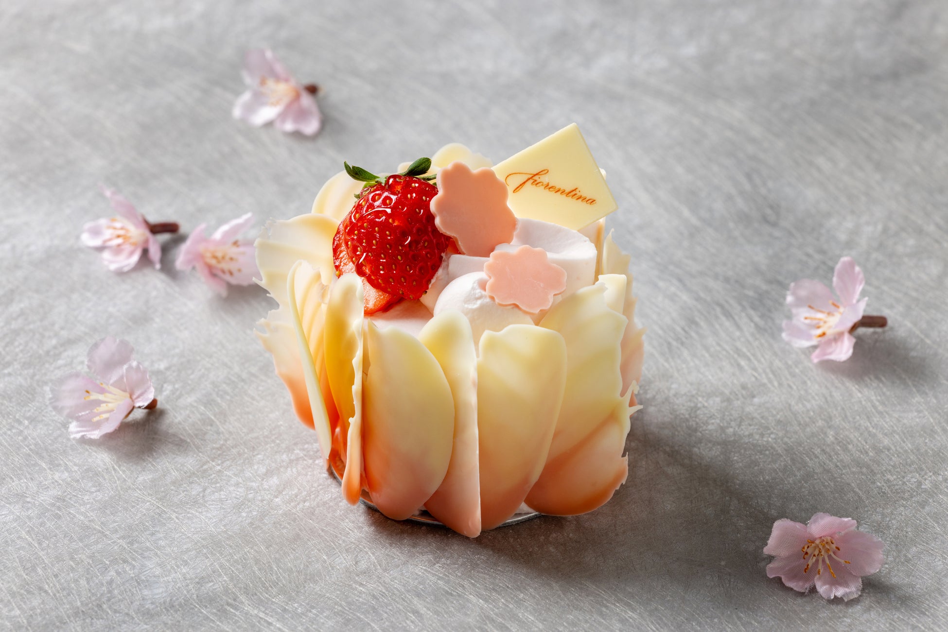 厳選したタヒチ産バニラビーンズをつかったクレームブリュレや桜風味のジャージー乳の生クリーム、甘酸っぱいいちごを、しっとりと焼き上げたくちどけの良いスポンジ生地でサンド。さらにケーキのトップにも桜風味の生クリームを絞り、春の訪れが感じられる一品に仕上げます。桜色の羽根のチョコレートをまとったアートのような美しいケーキです。