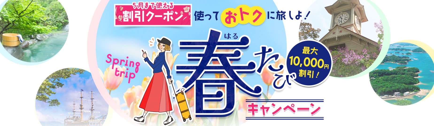 本キャンペーンでは、対象期間中に国内ダイナミックパッケージ(交通+宿泊)商品を新規お申し込みいただくと、1回あたりのお申し込みにつき最大10,000円割引のクーポンをご利用いただけます。