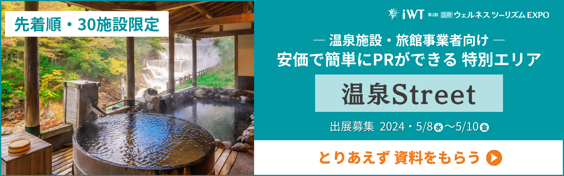RX Japan株式会社は2024年5月、ウェルネスツーリズムに特化した日本で唯一の商談展示会「第2回 国際 ウェルネスツーリズム EXPO」を開催いたします。その中で、温泉施設・旅館事業に携わる方限定の出展プラン「温泉Street」をご用意いたしました。温泉を有する旅館・ホテルが出展できる特別エリアで、通常の出展料金に比べ、半額でご提供いたします。