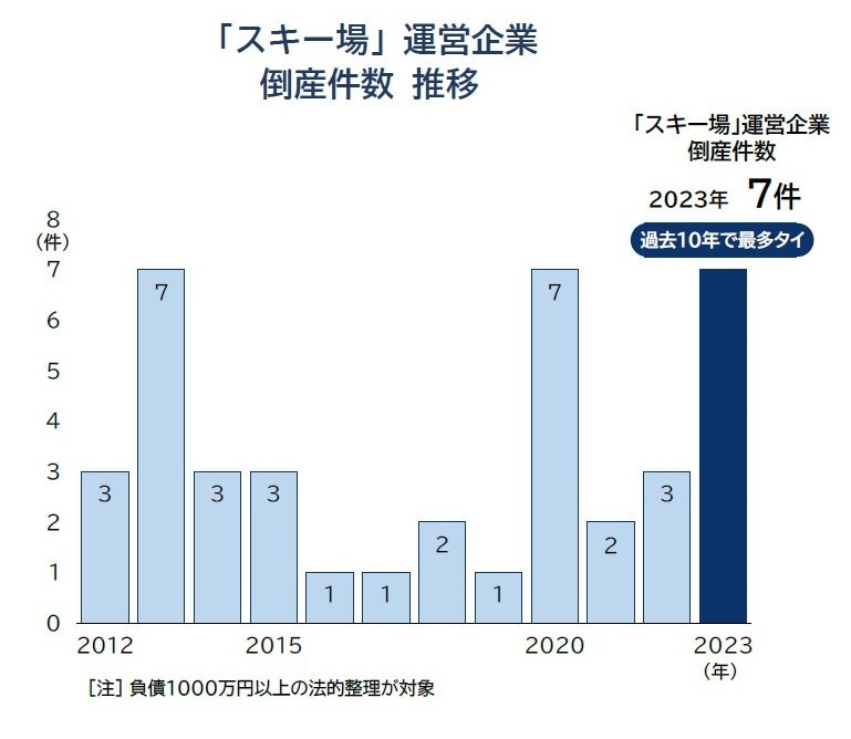 スキー場の倒産が増加している。2023年に発生したスキー場運営企業の倒産は、リゾート会社やホテル、第三セクターなど合計7件判明した。前年(3件)から倍増したほか、コロナ禍が直撃した20年と並んで過去10年で最多となり、スキー場倒産の増勢が強まっている。