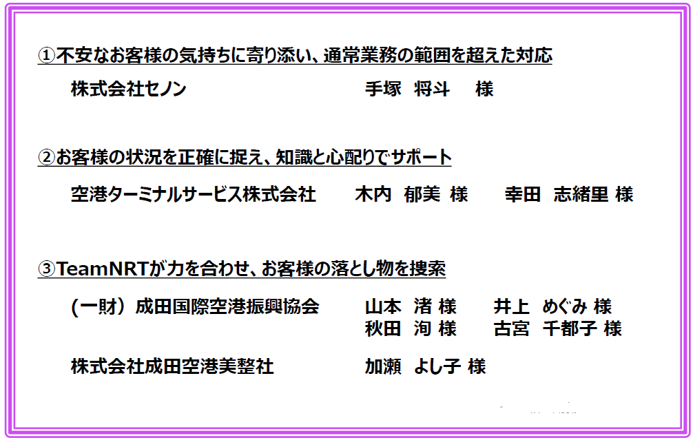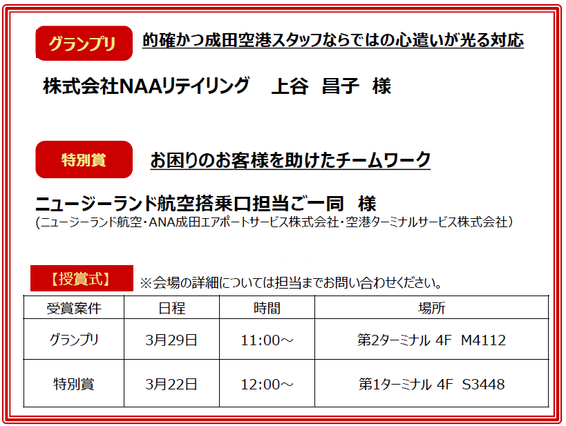 素晴らしいサービス事例を成田空港内に広め、空港スタッフのサービスレベルとモチベーションの向上を目的に、成田空港CS協議会が主催するお客様の期待を超えるサービスをしたスタッフを表彰する制度です。