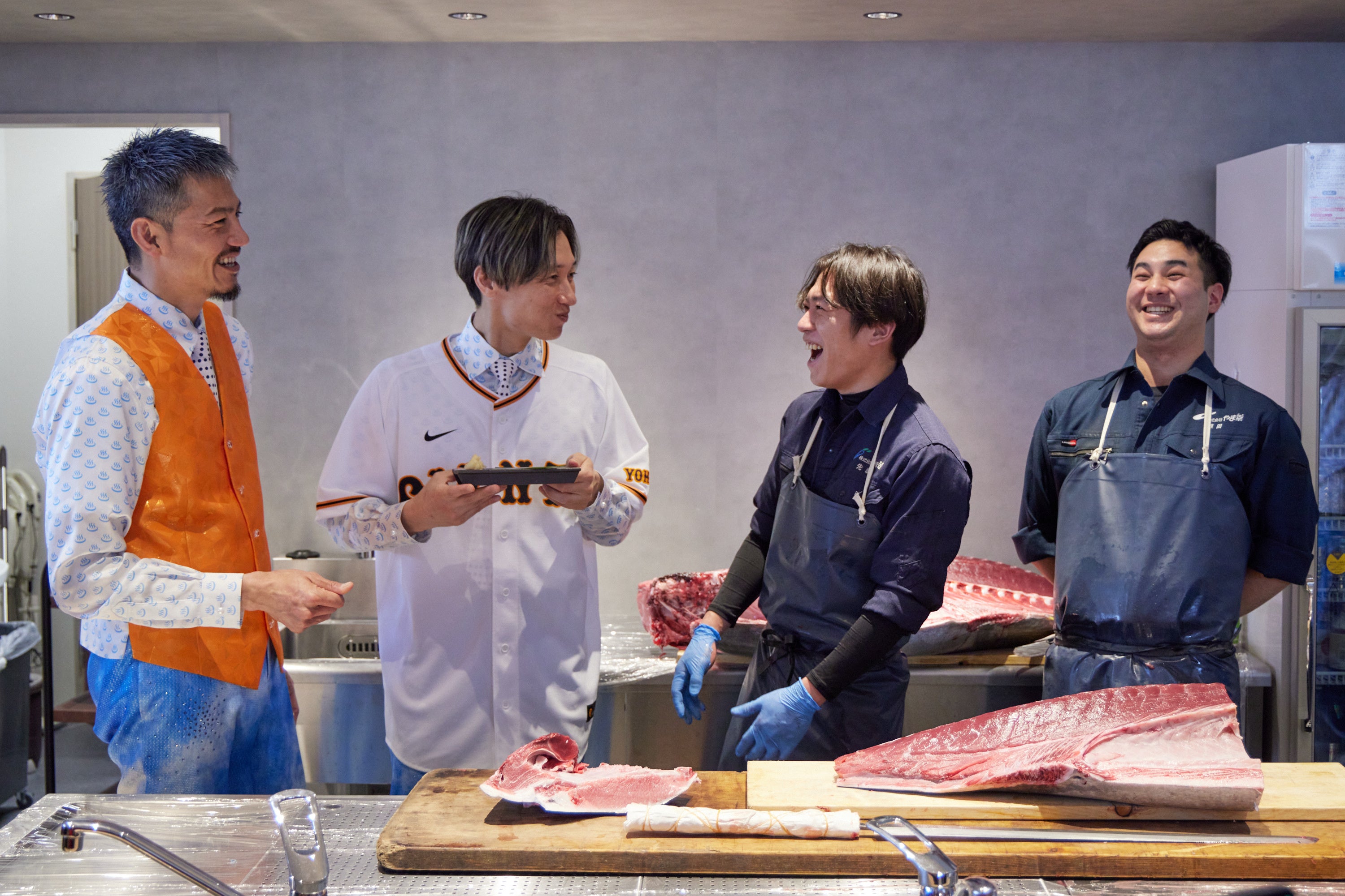 レストラン「美食ノ極」では、オープンを記念し、長崎県産73kgの天然本まぐろの解体ショーが開催されました。会場では純烈と約100名のお客様が食い入るようにショーを見つめ、まぐろに長い包丁が入ると大きな歓声が上がりました。純烈の白川さんはまぐろの握りを試食して「まぐろの脂がのっていて口に入れた瞬間溶けた」とその迫力を伝えました。