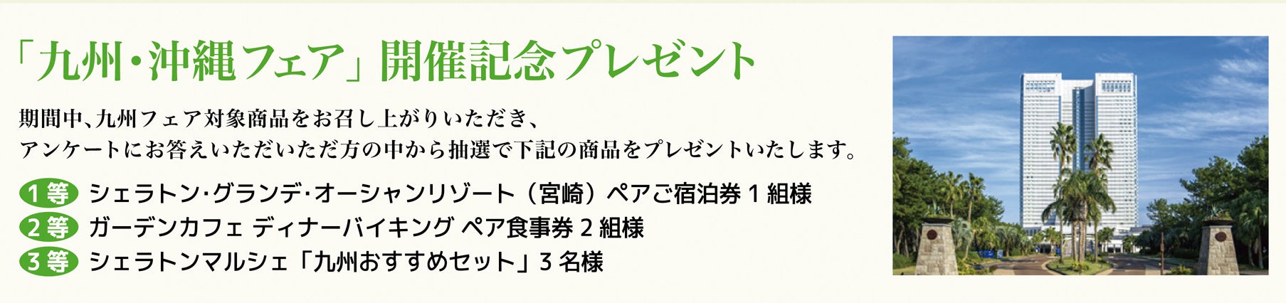 おなじみの熊本県、宮崎県「シェラトンセレクション」コーナーに加え、九州全県・沖縄県から届いた選りすぐりの商品を取り揃えております。(一部商品をご紹介)