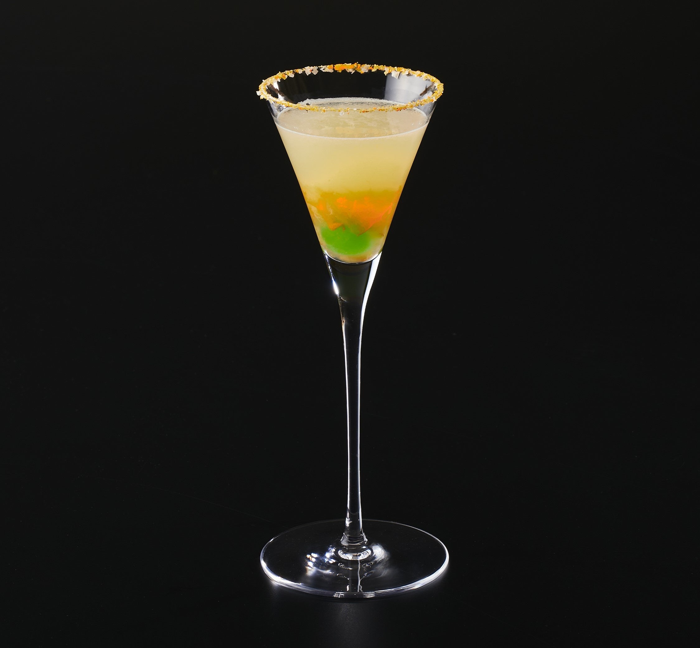 日向夏のマルゲリータ。さわやかな夏蜜柑塩で切れの良いショートカクテルに。グラスの底にひそんだマーマーレードがアクセントです。