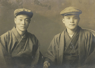 故郷の新潟県で撮影された若き日の加藤清二郎(右)