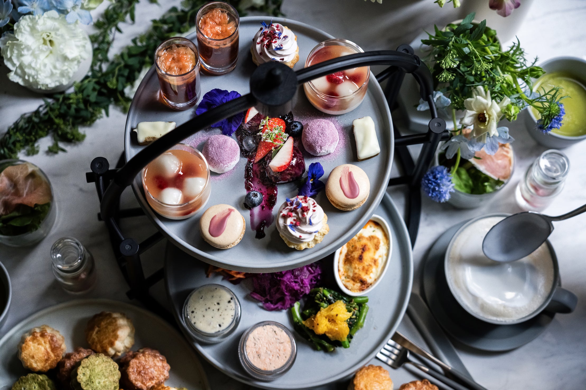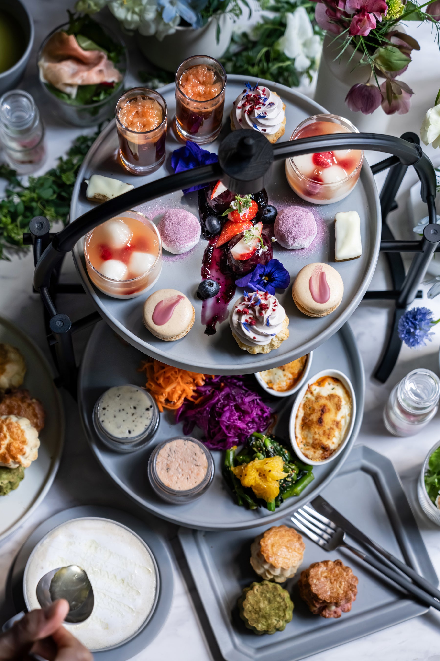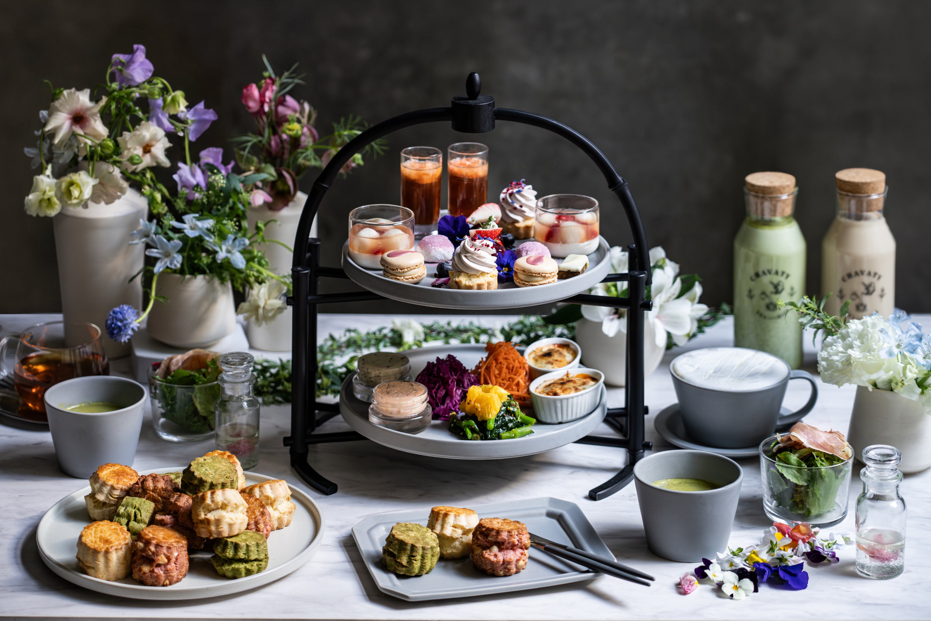 ベルガモットが上品に香るアールグレイはグレープフルーツと合わせ、透明感と軽やかさに満ちた口当たりの良いジュレにしました。柑橘の爽やかな香りとジューシーな果実味の立体的な味わいが魅力です。カモミールは白桃のとろける甘いソースと合わせ、淡いピンクに深みのある華やかな味わいが春にふさわしい、白玉入りのぜんざい仕立てにしています。すみれとルビーチョコレートのガナッシュタルトは、ルビーチョコレートのフルーティーな甘さに、すみれの香りが印象的に漂うフローラルな口溶けを合わせました。和洋を掛け合わせた、つぶ餡とブルーベリーのおはぎや、有機レモングラスをパウダーにして使用した香り豊かなスノーボールなどもお楽しみいただけます。セイボリーには、菜の花とオレンジのマリネやハニーナッツ&ドライフルーツのキャロットラペの他、桜花を浮かべた、桜が香るドレッシングでお楽しみいただく、生ハムとグリーンハーブのサラダや、緑が鮮やかなグリーンアスパラのポタージュなどをご用意しております。