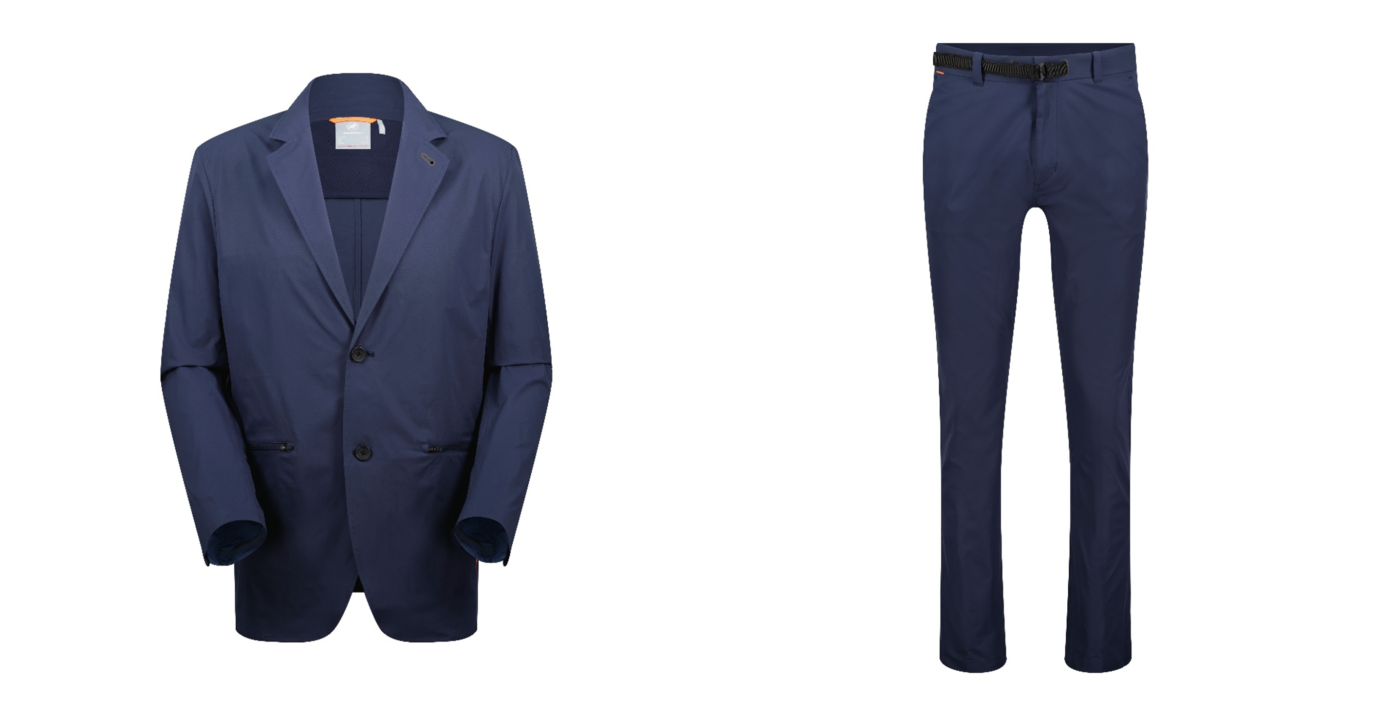 左:Active SO Set-Up Jacket AF Men。右Active SO Set-Up Pants AF Men。カラーは今年の新色ネイビーが加わり3色展開。ラペルの裏側に隠しポケットを入れ、アルパイン ジャケットを連想させる作りに仕上げています。スーツの為に新たに作り上げたパンツのベルト部は、カラビナにインスパイアされた特別仕様に。