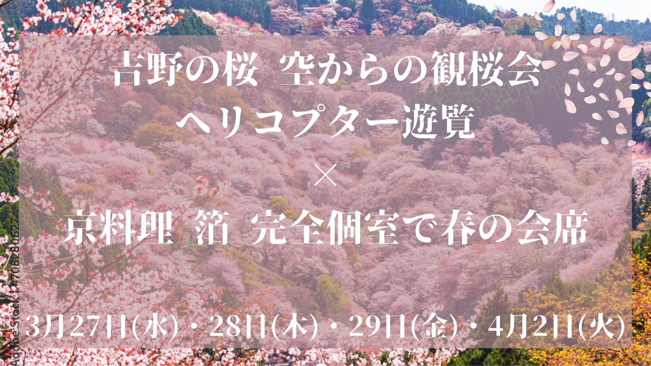 【京料理 箔 × ヘリコプター遊覧プランご予約受付中】日本一の桜の名所・吉野の桜を空から愛で、夜は京都の完全個室で春の会席に舌鼓を打つ贅沢桜の旅