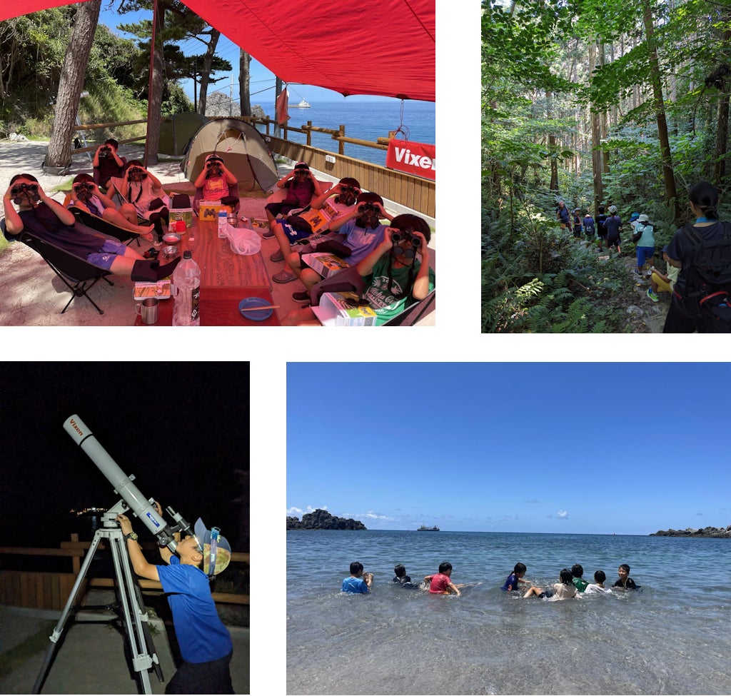 日中は登山に挑戦したり、海に飛び込んでみたり、崖を越えて絶景探検をしたりと心躍る冒険が盛りだくさん。夜は満天の星を見あげて宇宙体験。もちろん天体望遠鏡での天体観測も行います。食事はみんなでアウトドア料理、寝るのはテントに寝袋です。