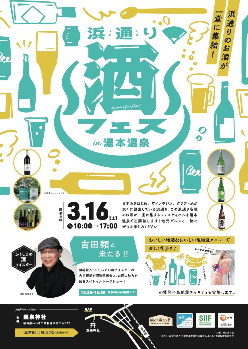 ⼀般社団法⼈ 東の⾷の会(東京都品川区)が主催するイベント「浜通り酒フェス in 湯本温泉」を、3月16日(土)に温泉神社(福島県いわき市常磐湯本町三函322)にて開催することをお知らせいたします。