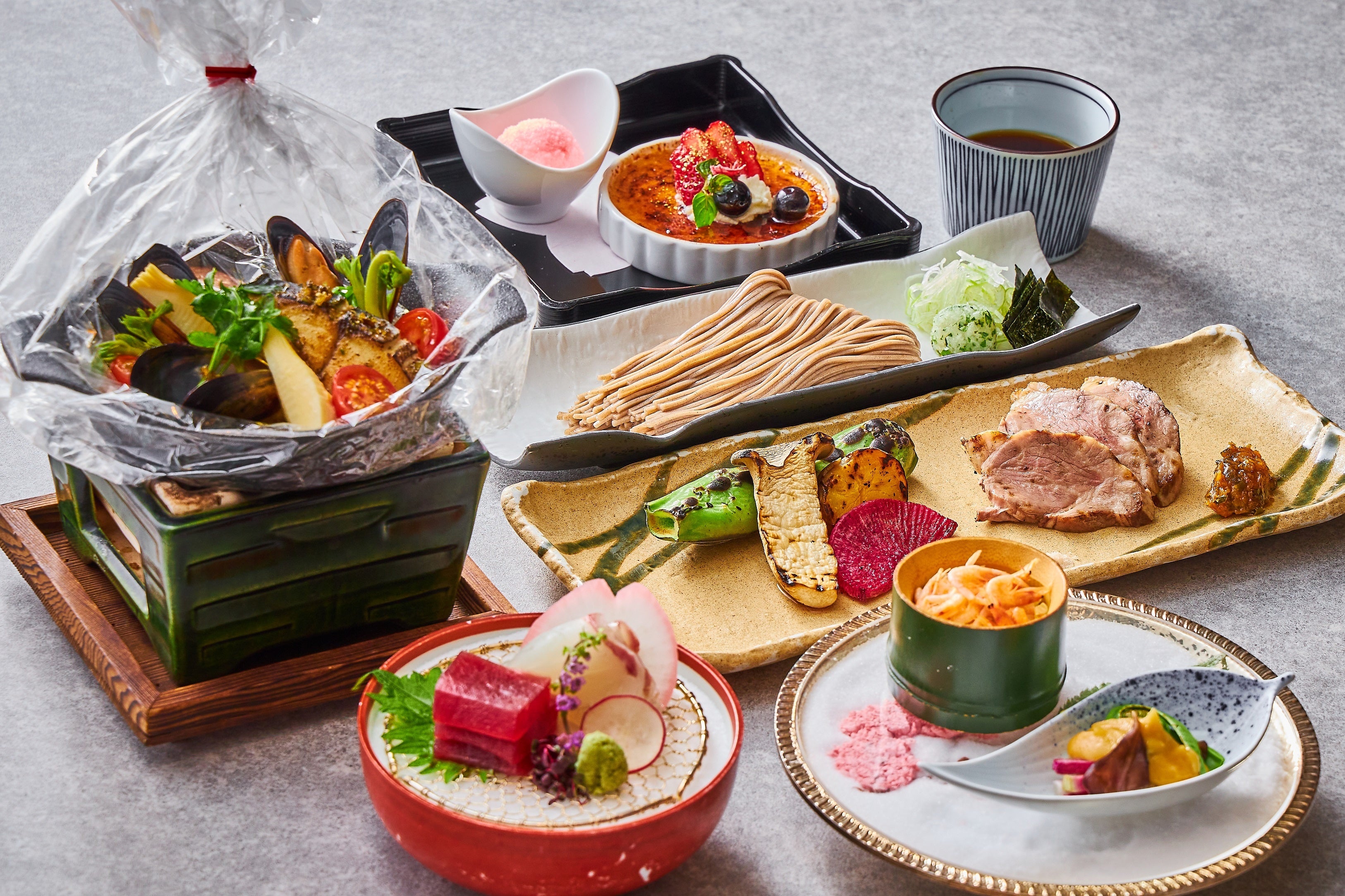 お肉もお魚もお召し上がりいただけるコース料理です。旬の春食材をちりばめ、コース全体で春の味覚をお楽しみいただけます。七輪料理は旬の鰆と山菜を使ったアクアパッツァをご用意いたします。日本料理らしく吟醸酒を使用し、海鮮の旨み、山菜の苦み、トマトの酸味とさまざまな旨みが凝縮した至福の一品です。さらに、旬香自慢の焼き物では、ブランド豚「安曇野げんき豚」を桜チップで燻製し、ご提供いたします。燻製ならではの独特の香りとお肉の持つ旨みを引き出した味わいをお楽しみいただけます。この香りや味わいに合わせて楽しめる日本酒もございますので、ぜひお料理と一緒にお楽しみください。