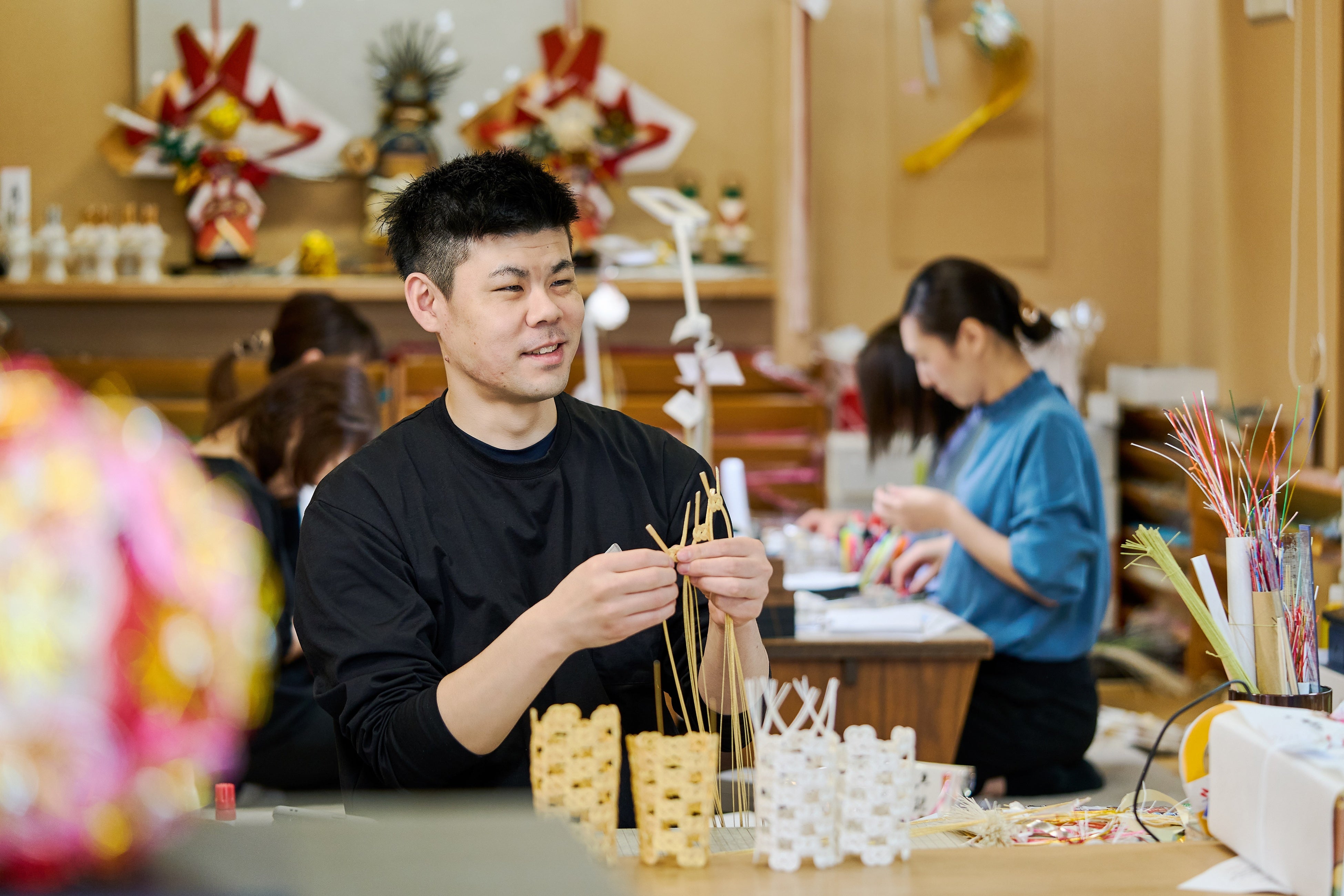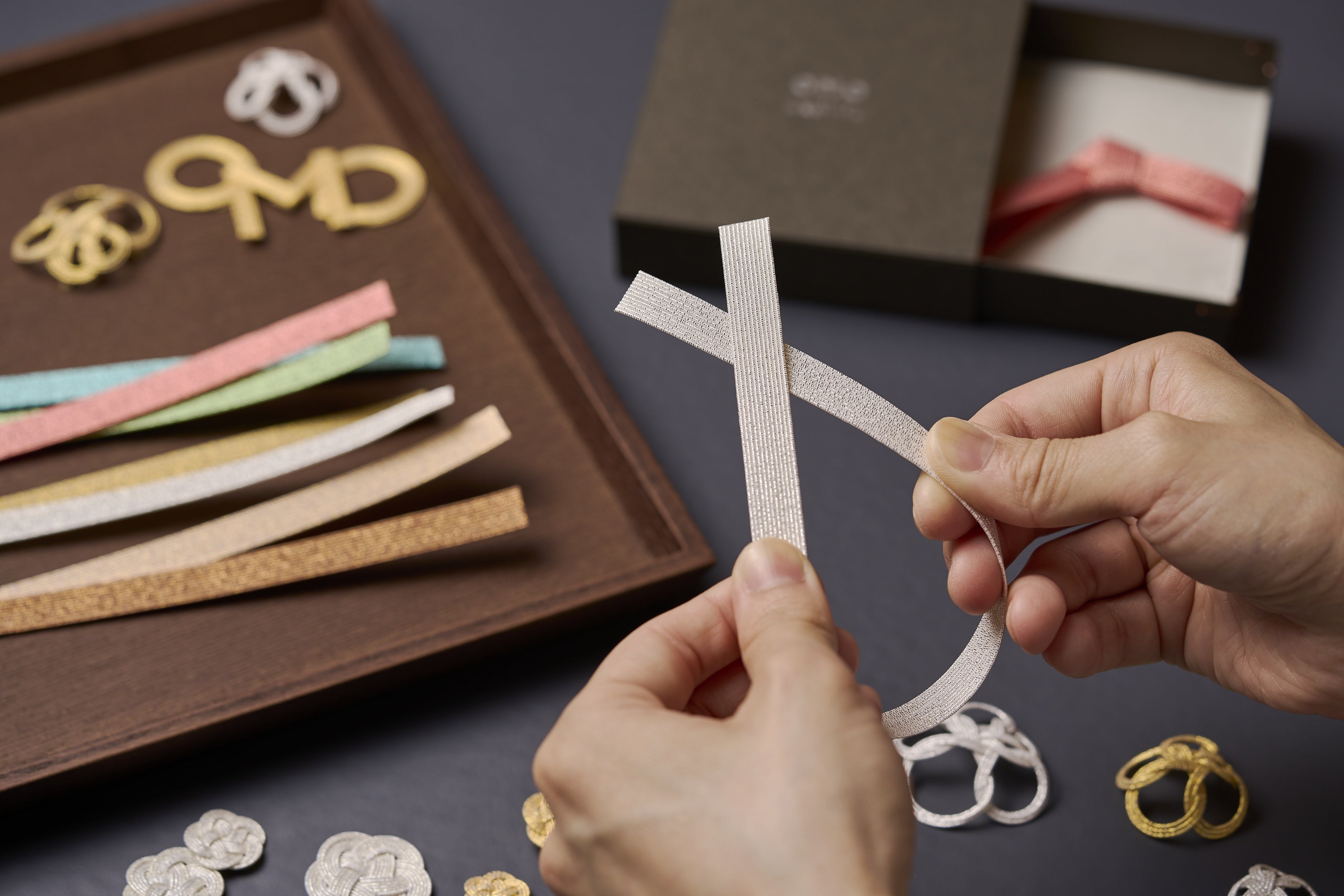 日本の伝統的ラッピングともいえる水引。その基本工程は和紙で「包む」、水引で「結ぶ」、贈る人の気持ちを毛筆で「書く」の3つ。約1世紀前、石川県金沢市の津田左右吉(加賀水引初代)がそれまで平面的デザインだった和紙の折型を立体的に仕上げ、水引の紐細工を造形的な結びに進化させました。2代目津田梅の代にこの作風が「希少伝統工芸 加賀水引細工」として確立するに至ります。加賀水引は現在5代まで継承され、水引の本質を守り伝えながら進化させています。