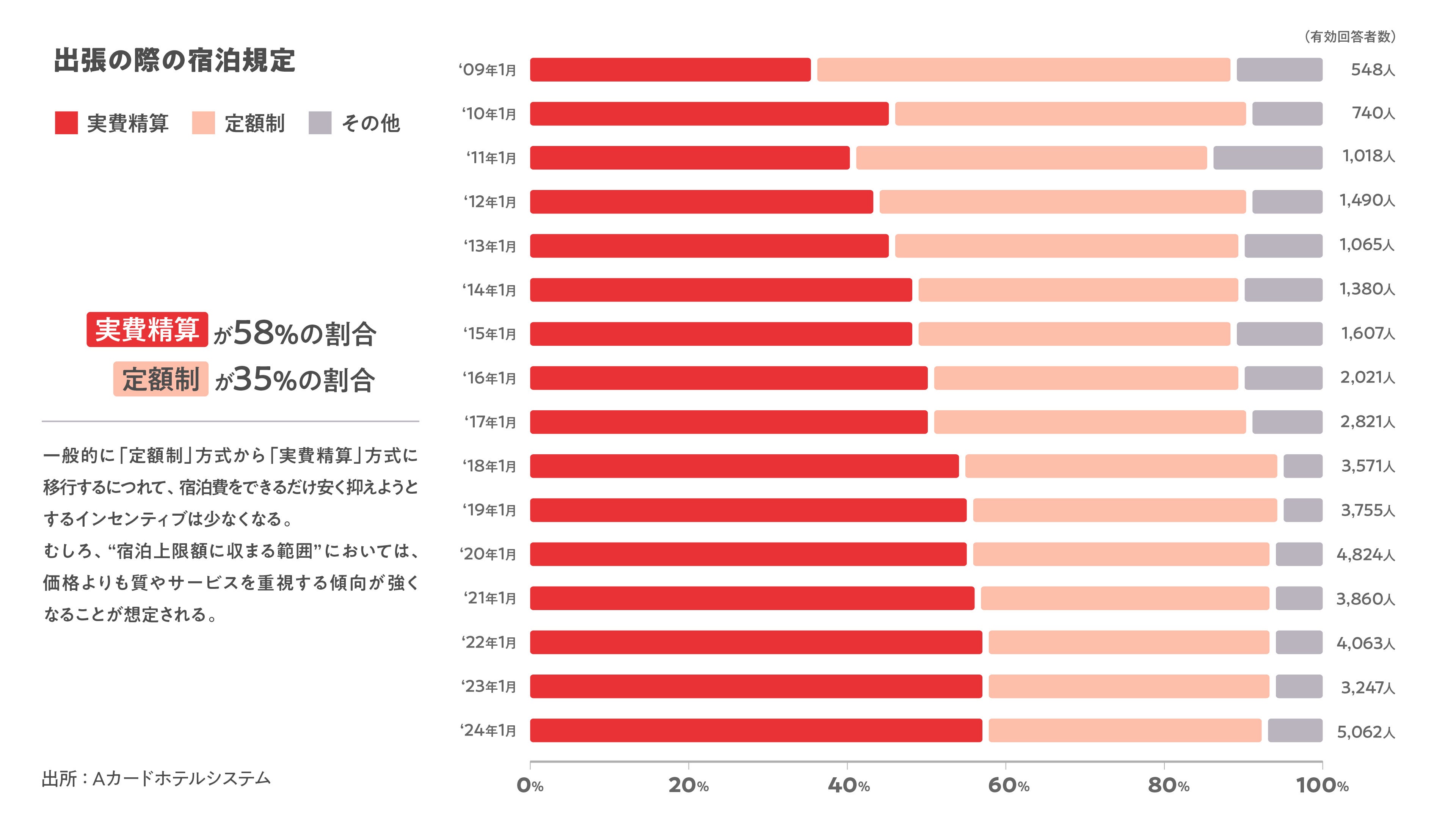 客室平均単価の上昇は、企業が宿泊規定の変更を迫られることを意味しており、たとえば、上限1万円から上限1万5,000円に変更するなどの対応が必要になります。また、宿泊費の上昇は企業にコスト増をもたらす可能性があり、経費削減のために「定額制」から「実費精算」へ切り替える企業が増加することは想像に難くありません。当社の調査データにおいても、「実費精算」は増加傾向にあり、2024年1月時点で、全体の58%を占めています。これまで「定額精算」を採用していた企業においては、定額よりも安価なホテルに宿泊することで生じる「差額」を、お土産物代や飛行機のアップグレード等に使用することも可能でしたが、「実費精算」に切り替わると、そうした活用が難しくなります。さらに、これまで国家公務員においては、旅費法に基づき「定額」支給されていた宿泊費等について、2025年度より「実費精算」に変更される予定となっています。
