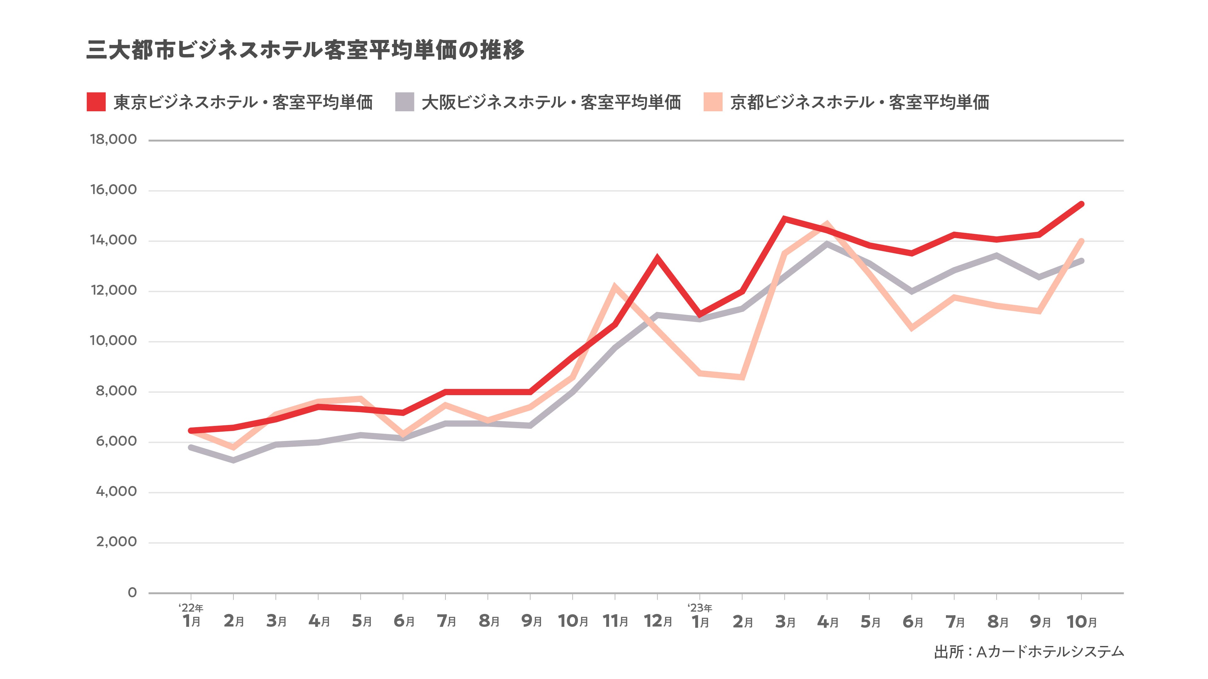 日本政府観光局(JNTO)の報道発表資料[is1] (2024年1月17日)によると、昨年12月の訪日外客数は273万4,000人で、「新型コロナウイルス感染症拡大後で単月過去最多」を記録。また、折からのインフレ、日本各地で誘致が進む半導体関連施設や大阪・関西万博の建設工事に従事する作業員、関係者の宿泊需要も相まって、客室平均単価は上昇傾向にあります。当社が独自に集計した東京、大阪、京都のビジネスホテルの客室平均単価の推移は以下の通りであり、2年弱で2倍以上になっている様子が窺えます。