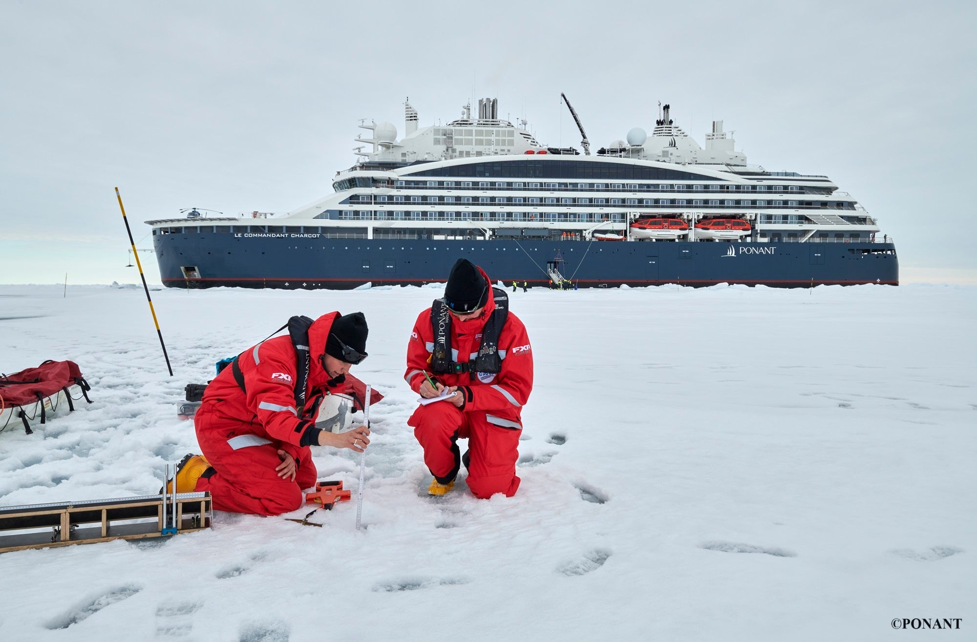 ポナンは、研究設備の整った砕氷船「ル コマンダン シャルコー」により、AWIが科学的データ測定を向上させるためのプラットフォームを提供し、また北極圏のシーズンを通して氷の厚さのデータも継続的に提供しています。航海中はゲストを対象に、サイエンスチームによる船上レクチャーも行われます。