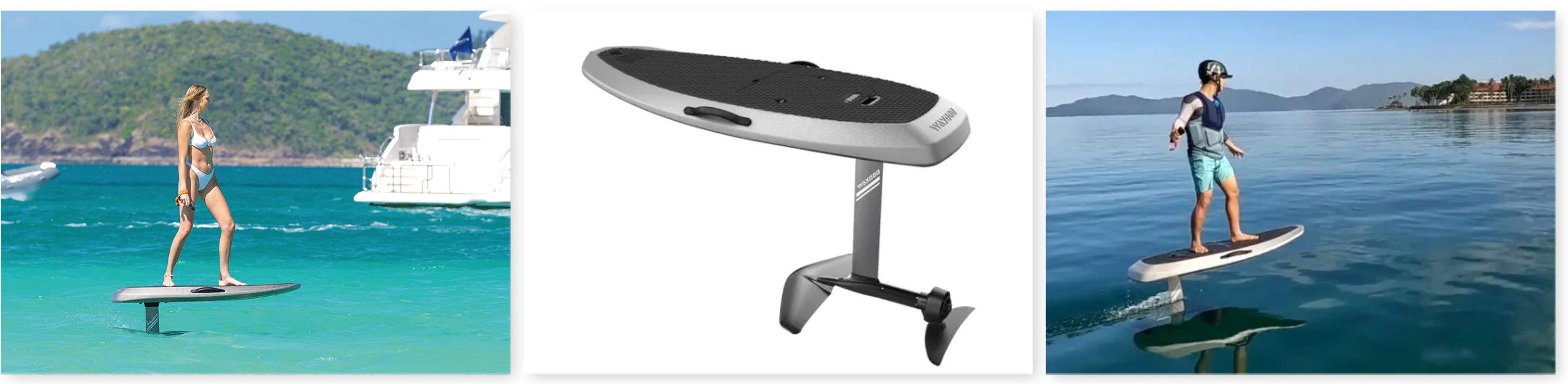 免許不要で乗れる電動フォイルボード。水面から浮上して飛ぶように移動するため、水の抵抗を受けることがなく、最大22km/hの疾走感でスムーズな高速移動が可能です。波や風など天候に左右されず、持ち運びも容易なサイズのため、自由自在に水上フライト体験が楽しめます。