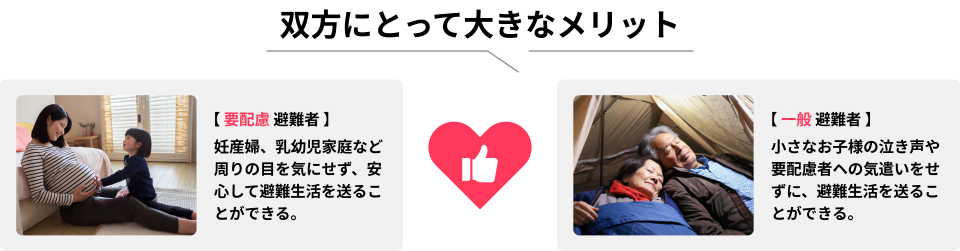 災害発生時に、要配慮者の一時避難先として民泊施設を提供します。災害時に多くの方が避難生活を送る避難場所では、妊産婦や夜泣きする乳幼児など他の被災者と同じスペースで避難生活を送ることが難しい要配慮者が在住しています。要配慮者と一般避難者にとって安心した避難環境となるために、避難場所が独立する民泊施設を要配慮者の避難に利用いただくことで、避難されているすべての方が安心して避難できる環境となります。