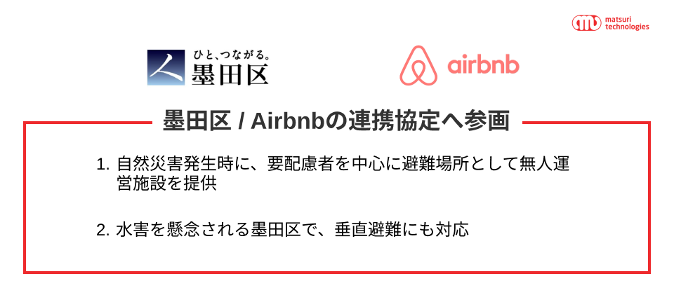 「災害大国である日本では、地震や水害等の自然災害への対策は不可欠であり、自治体によって防災計画や危機管理対策が綿密に組まれています。非常時にこうした対策を機能させるには、平時から民泊施設が有事の一時避難先として活用されるように行政や地域コミュニティから認識されることが重要です。matsuri technologies社とともに地域に貢献できることを嬉しく思います。」