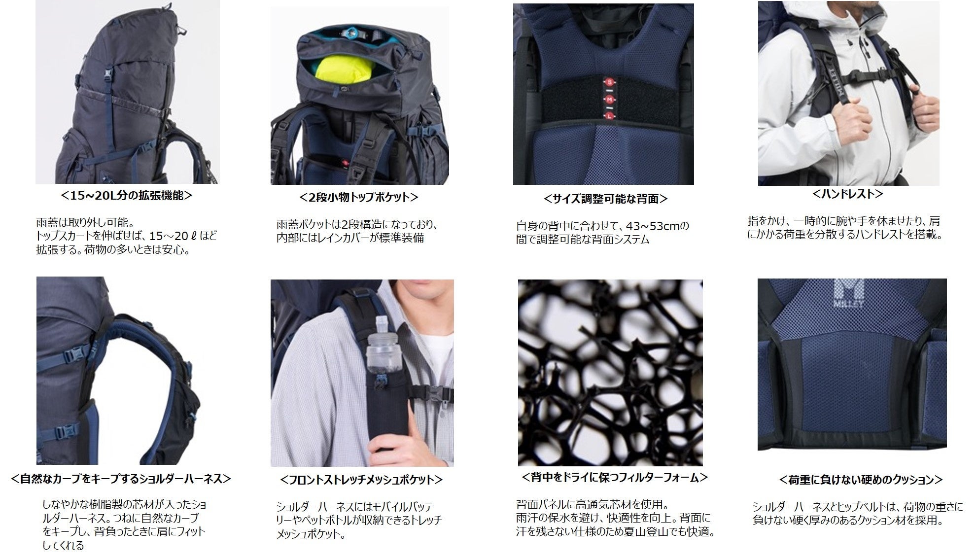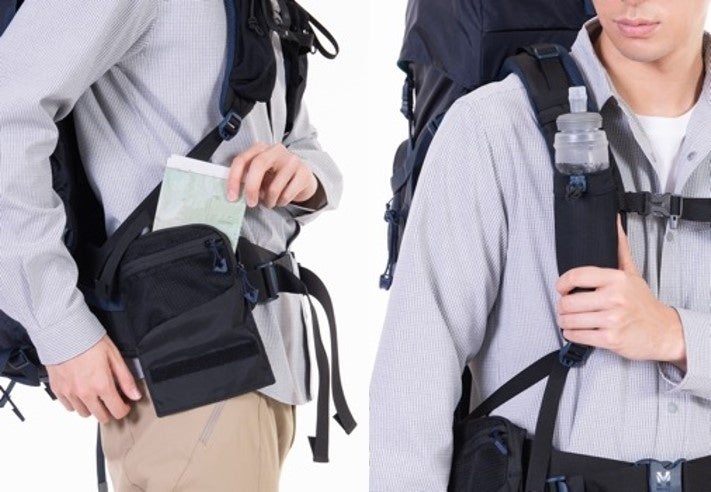 特に大型では、山行中の荷物の背負い直しをなるべく減らすべく、背負いながらすぐにアクセスできるショルダーハーネスとヒップベルトの収納力をアップデート。