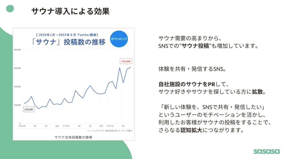 なかでも注目すべきは、近年都心部で増加傾向にある「個室型貸切サウナの利用」。同社では、男女の利用割合を例に「このカテゴリは今後も一定のニーズがあり伸びていくことが予想される」と結論づけています。