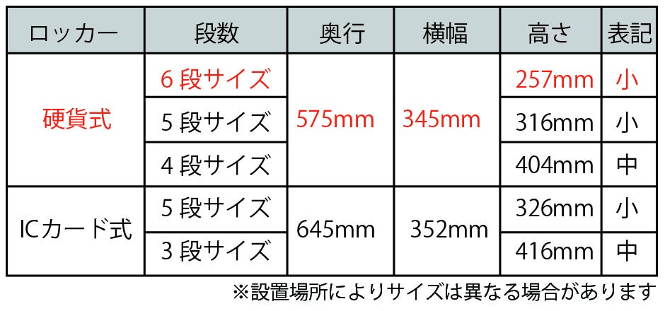 コインロッカー対応サイズは硬貨式の最小サイズを元に数値化することで、幅広いサイズのロッカーに対応します。