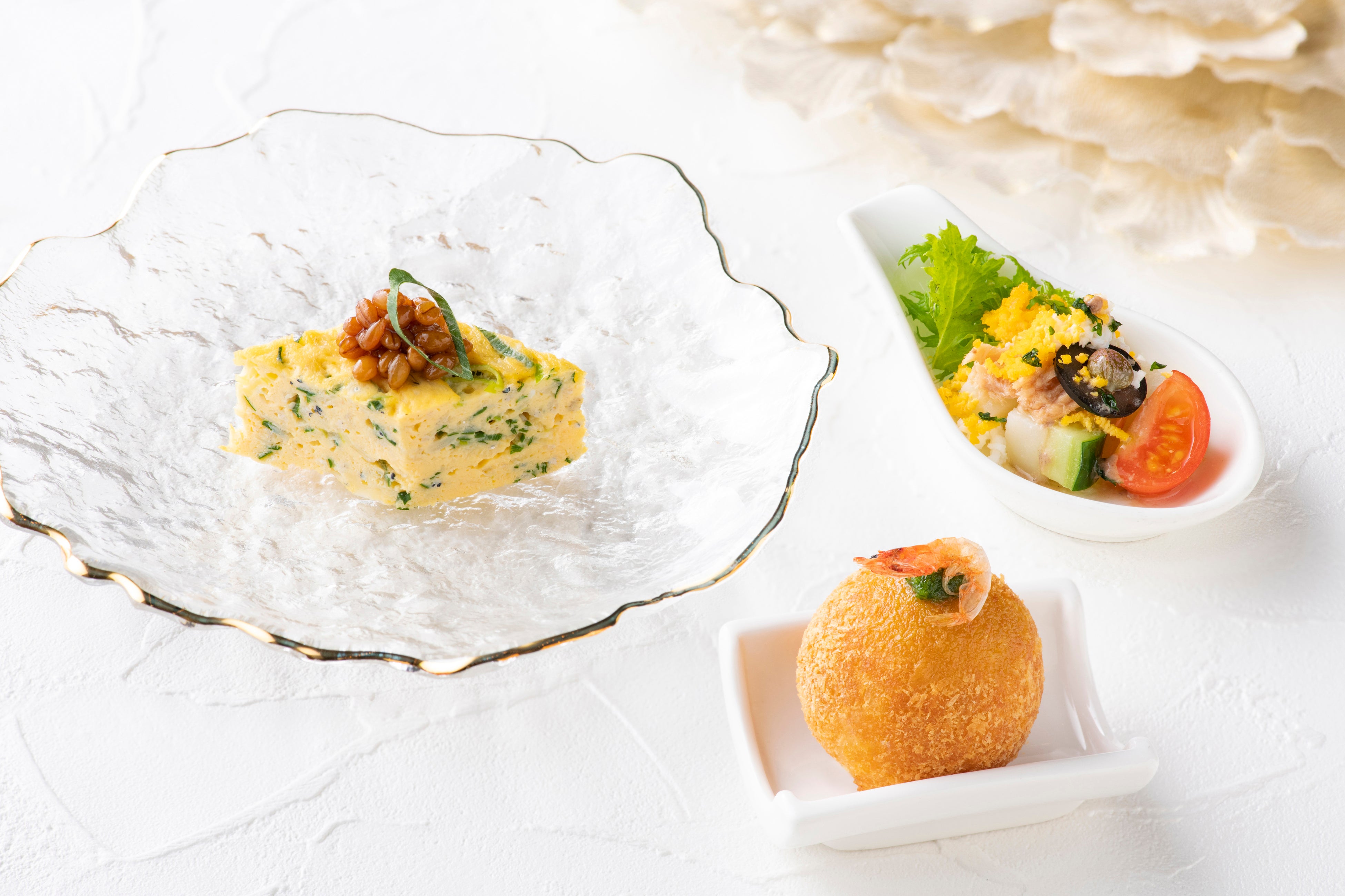「桜えびとアスパラガスのアランチーニ」(写真中央)