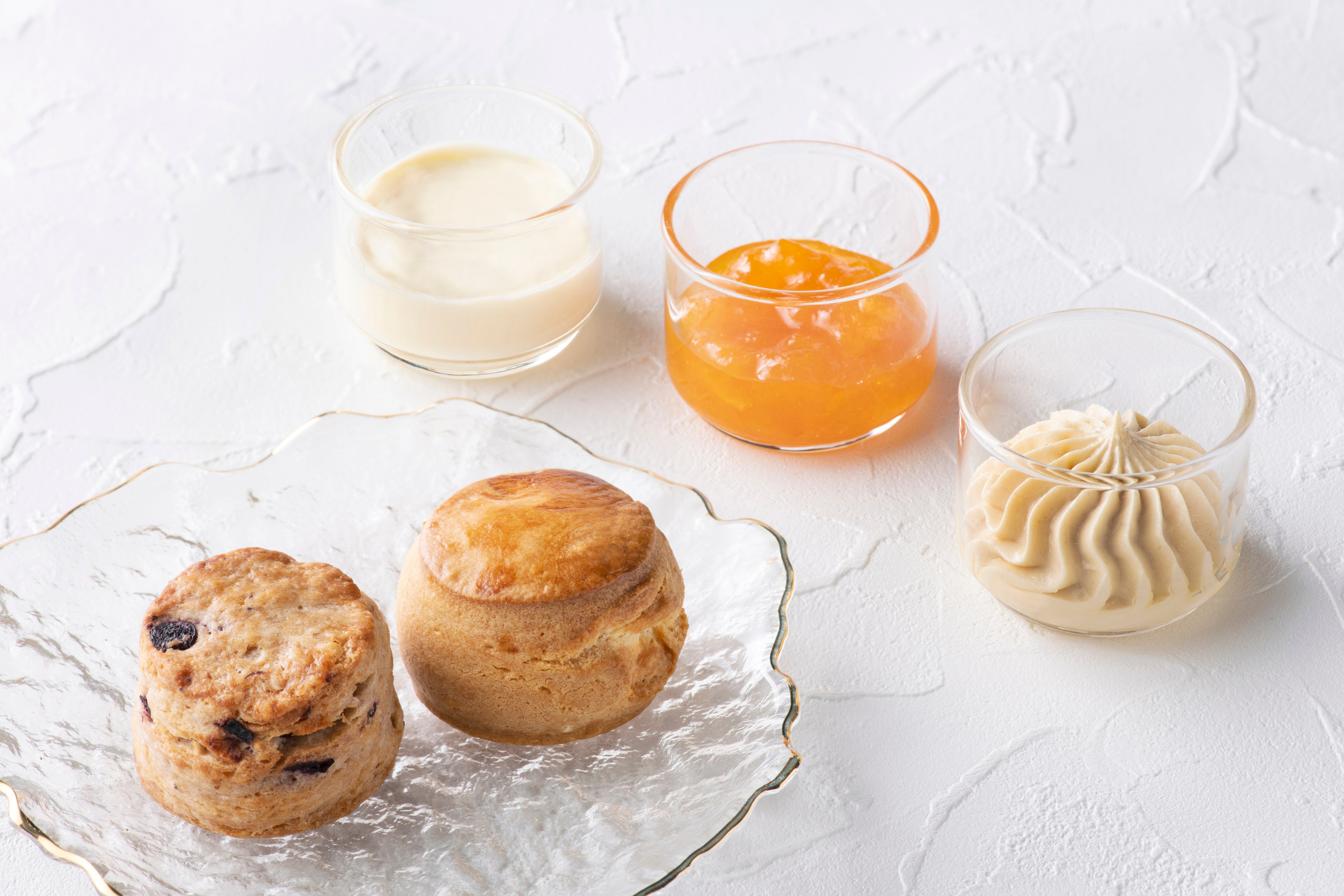 定番のプレーンスコーンの他、ドライブルーベリーとブルーベリーソースを練りこんで焼き上げたブルーベリースコーンを今期限定で提供いたします。コンディメントには、なめらかな口溶けのクロテッドクリームや、オレンジとアプリコットの果肉をふんだんに入れたさっぱりとしたジャム、地元千葉県産のピーナッツペーストとバナナピューレを合わせた濃厚なクリームをご用意。お好みに合わせてご賞味ください。