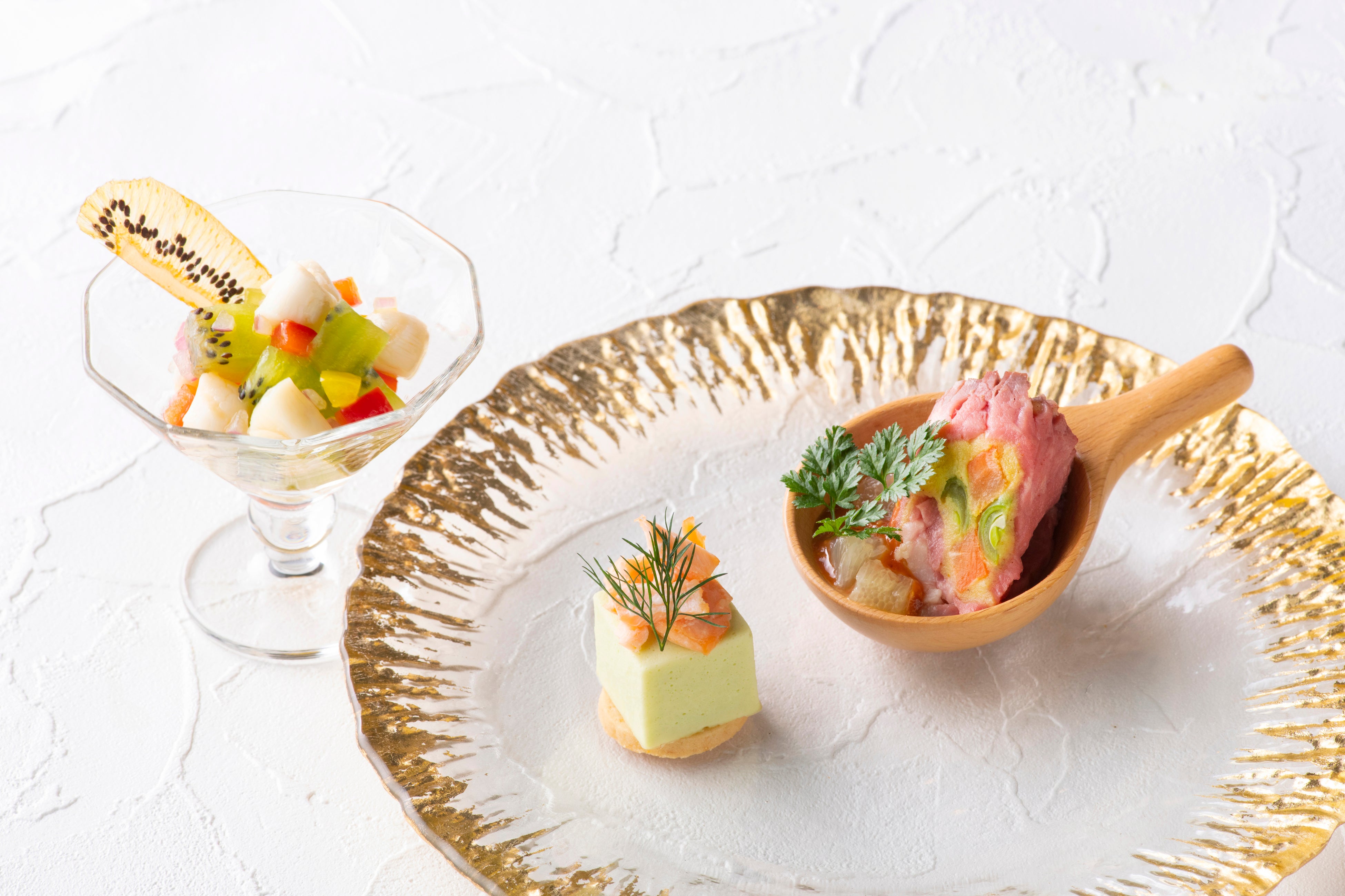 「枝豆のムースとサーモンのコンフィ」(写真プレート左)