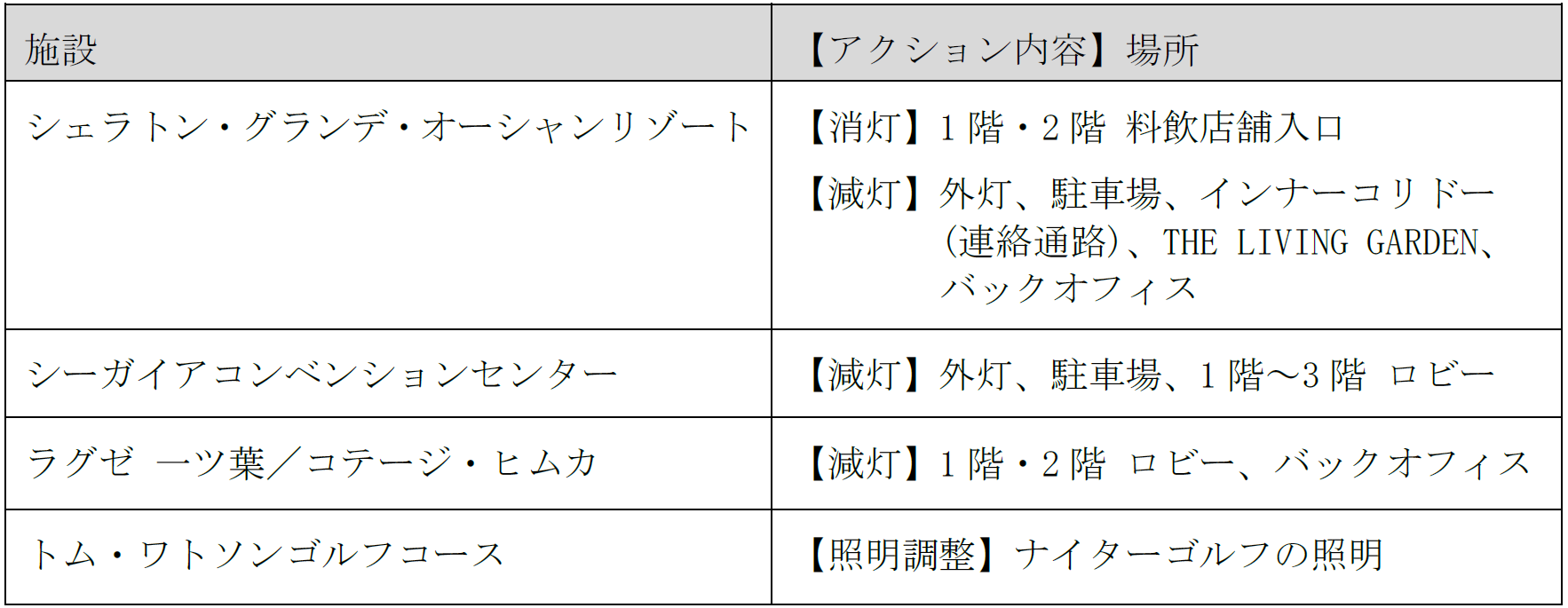リゾート内の各所で3月23日20:30に消灯・減灯を実施
