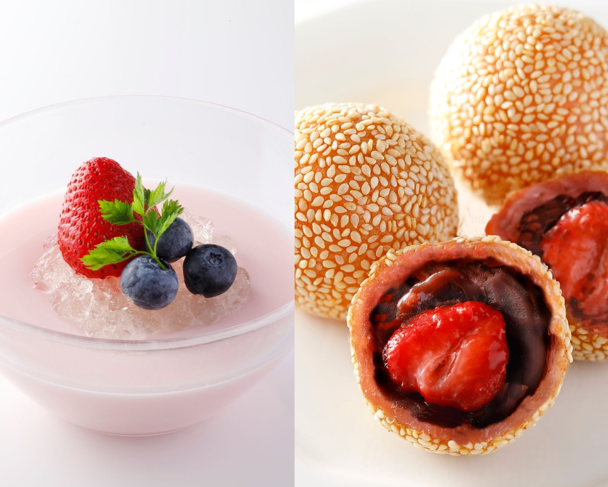 デザートには「春のスイーツ盛り合わせ」として、苺風味の杏仁プリンにあまおうのコンポートを添え、レモン風味のジュレとともにお召し上がりいただく苺の杏仁プリン あまおうコンポート添え、あまおうコンポートが入ったもちもち食感のあまおう胡麻団子と日替わりスイーツの3種の盛り合わせでご用意いたします。