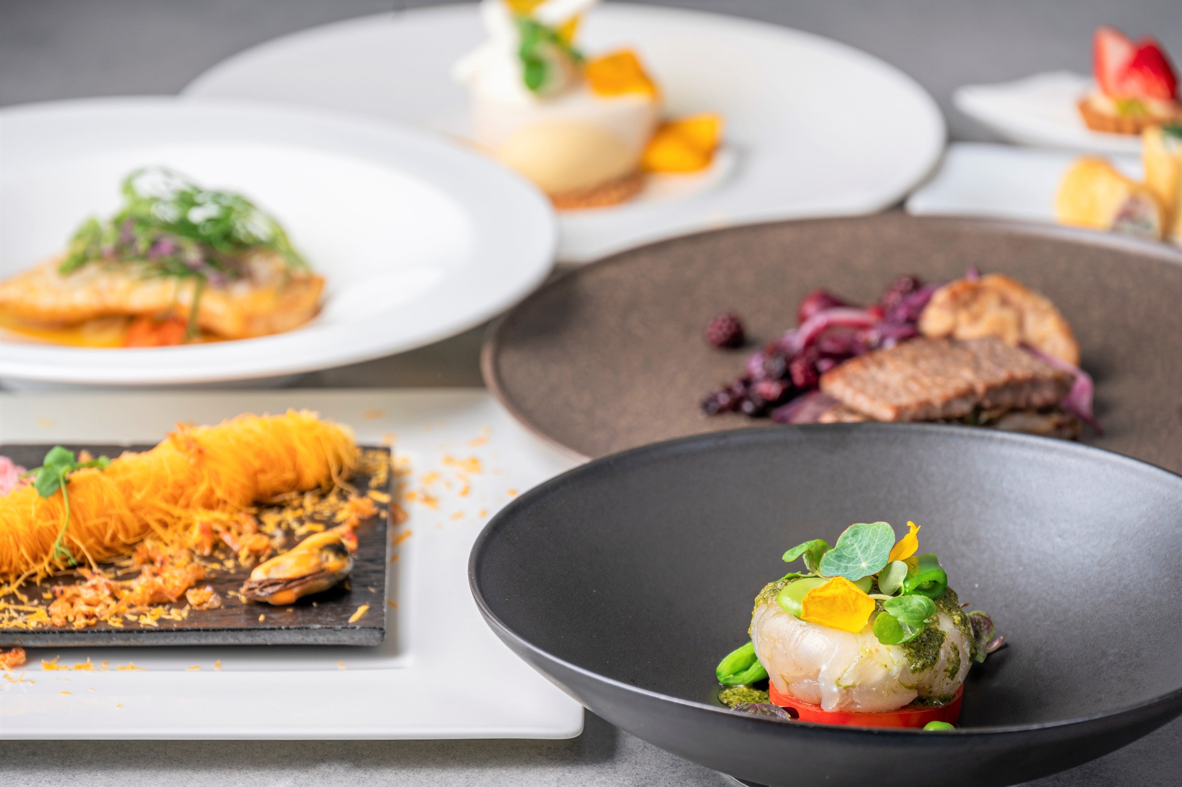 前菜には淡泊な味わいの中にほんのりとした甘さが特徴の鱸を薄く切り、イタリア産フレッシュチーズの「ブッラータ」を茶巾の様に包み込みました。春野菜のそら豆をはじめ、グリーンピースやスナップエンドウをあしらい、仕上げには黄色の「エディブルフラワー」をデコレーションし、ジェノベーゼソースでお楽しみいただけます。温前菜は、パステルオレンジの「カダイフ」をホワイトアスパラガスに巻き付けてオーブンで焼き上げ、クセの少ない穏やかな味わいが特徴の「ミモレット」をたっぷりと削り仕上げます。アクセントには、揚げた桜エビとムール貝のコンフィ、桜色の塩を添えます。魚料理では、程良く脂がのり淡泊な味わいの中にほのかな甘みと旨味が特徴の甘鯛を使用。鱗焼きにしてカリっと仕上げた甘鯛を、あさりのジュースや魚の出汁などで抽出したブイヨンをゲストの前で注ぎ仕上げます。淡い緑が美しい茹でた「おかひじき」、紫蘇の花が開き始めた淡紫色が特徴の「花穂紫蘇」や、葉がハートの形の「アニスイート」をデコレーションしました。暖かく心地良い春を満喫するフレンチコースをどうぞお楽しみください。