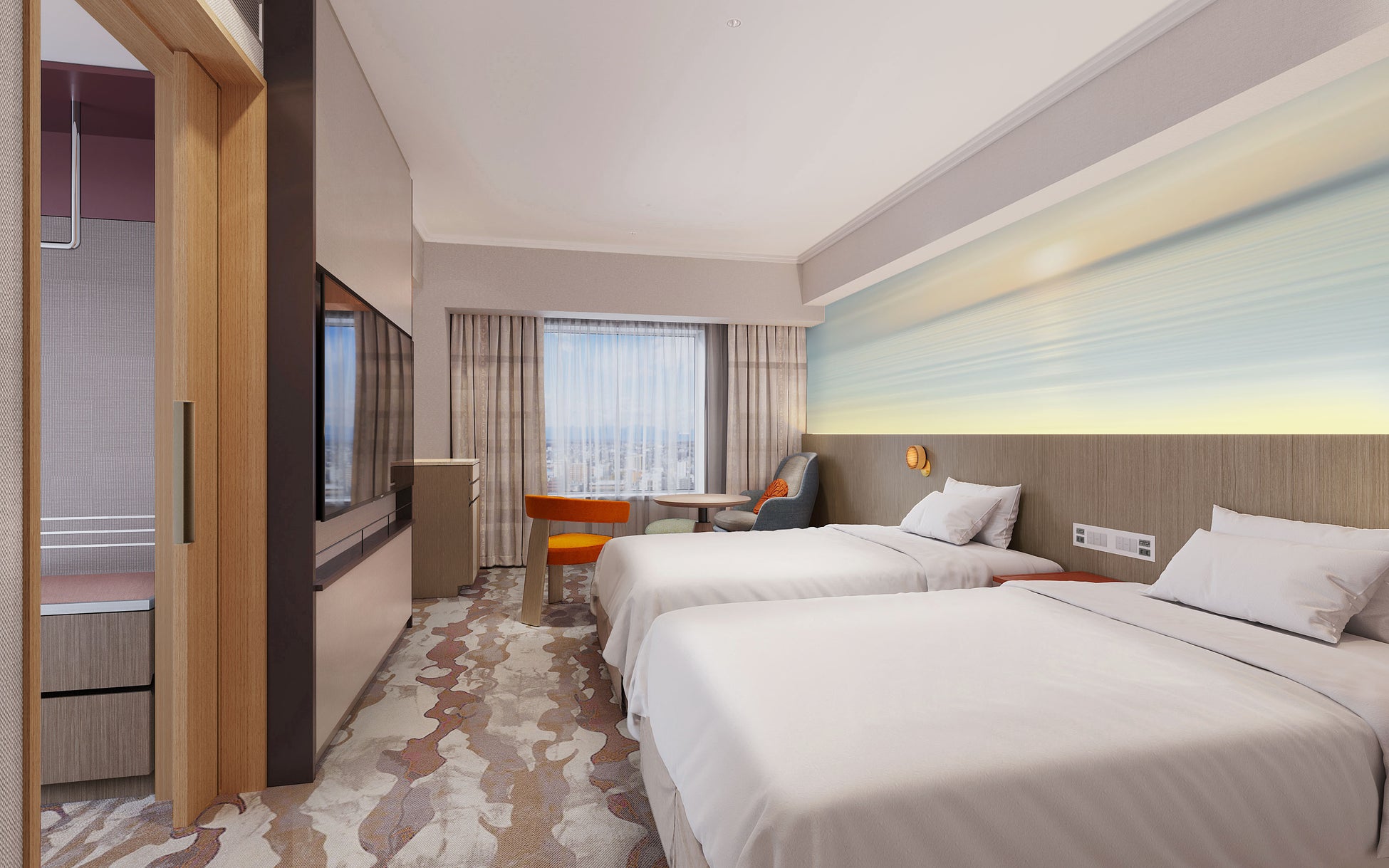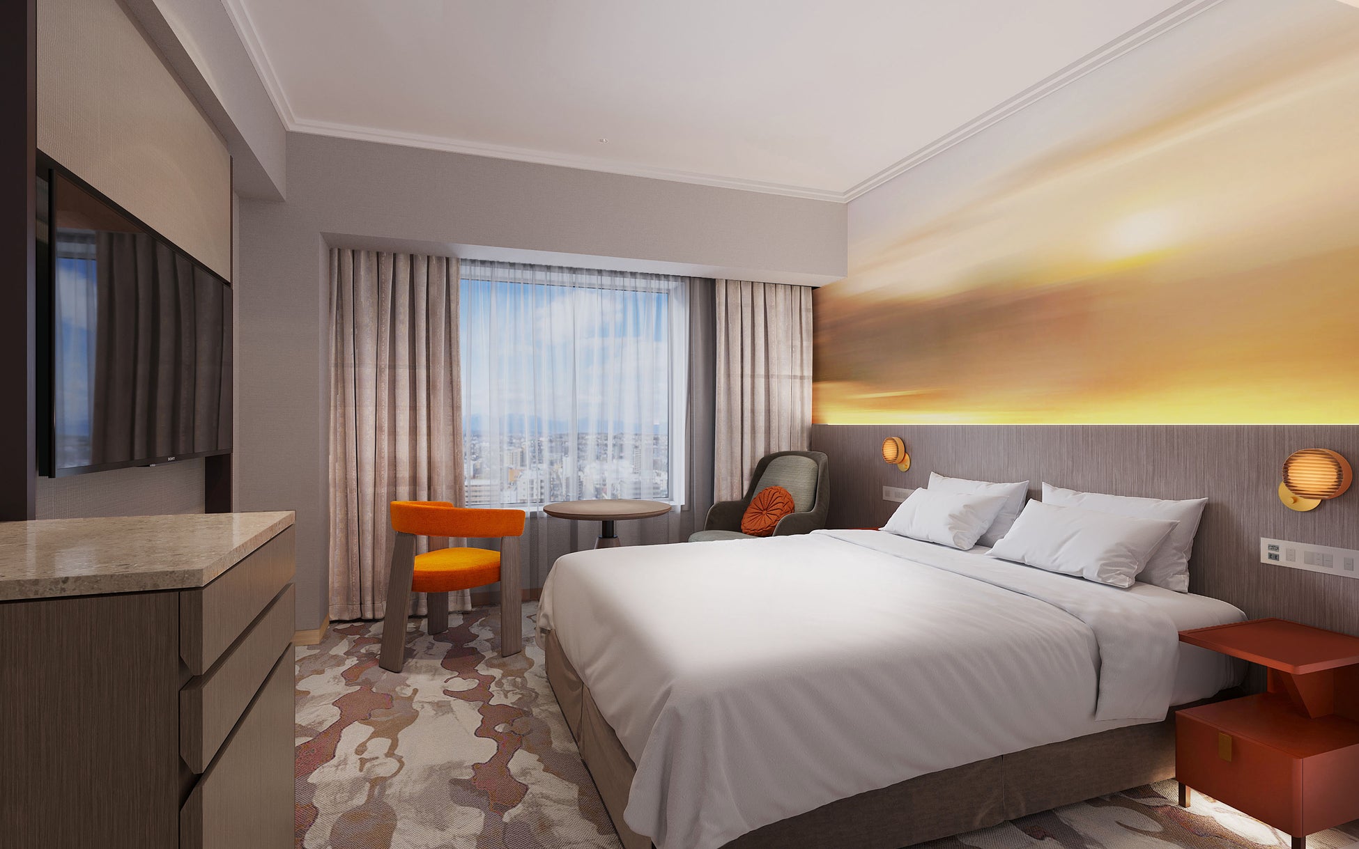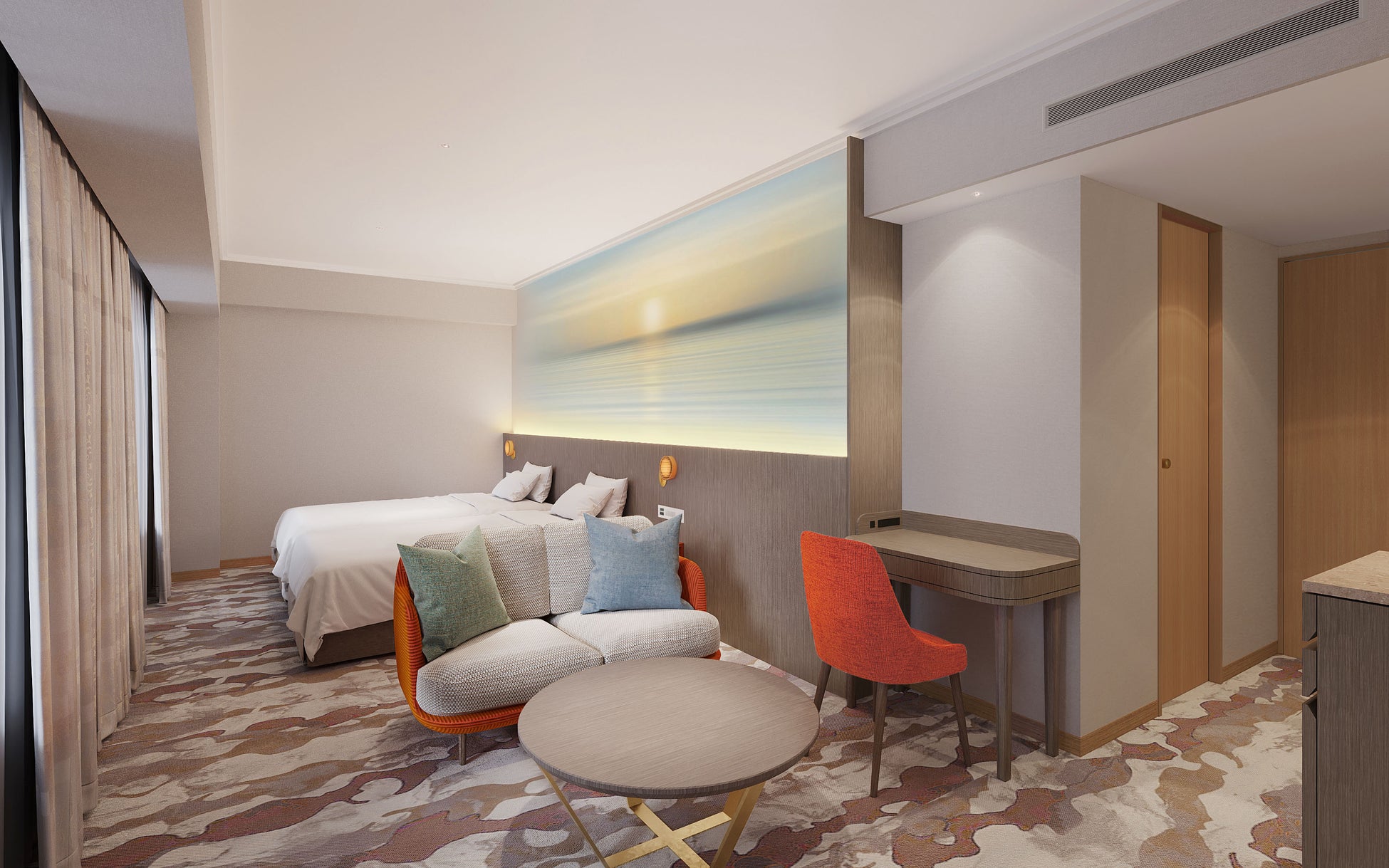 都ホテル 四日市(所在地:三重県四日市市安島1-3-38)は、ホテル14階ゲストルーム16室を「プレミアムフロア」としてリニューアルします。生まれ変わった客室は、三重県の玄関口、四日市のランドマークとして、ビジネスやレジャーを目的とした国内外のお客様の利用を想定し「Floating Light」をデザインコンセプトに、太陽の動きや放射線をイメージした壁紙やカーペットを新調。海側は青で朝日を、山側はオレンジで夕日を感じる非日常のラグジュアリーな空間に仕上げました。