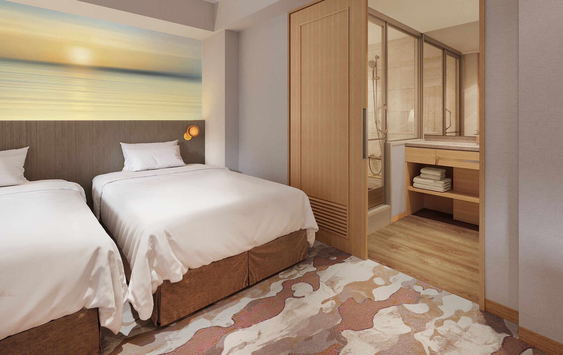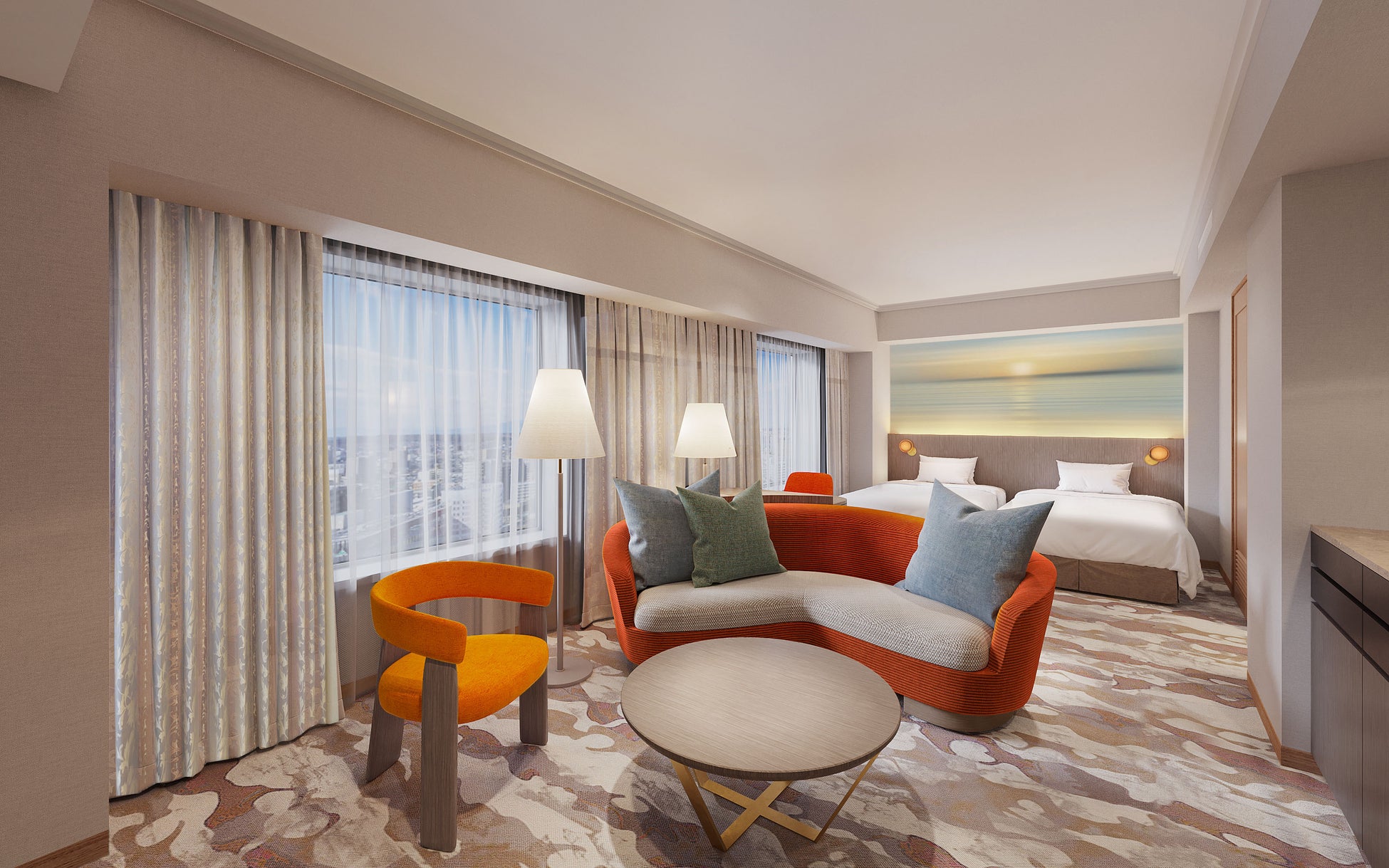 先立ってリニューアルしたスイートルームやゲストラウンジのデザインを意識しつつ、新たにモダンさも取り入れた客室でおくつろぎください。