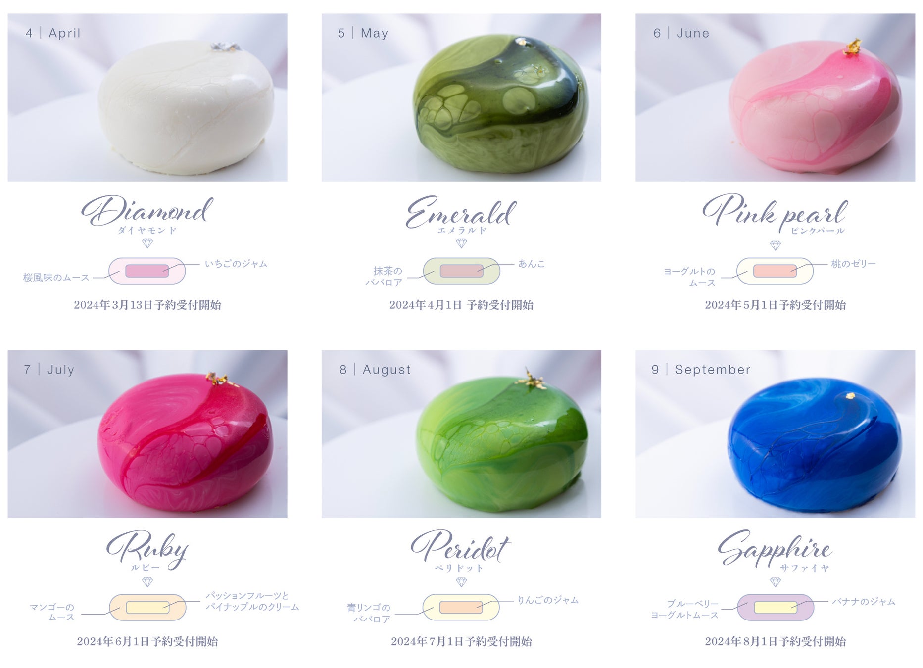 例えば、2月の誕生石のアメジストは、紫色のカラーの素材すみれとベリーのテイストで、また6月のピンクパールは、その淡いピンク色のカラーに合わせ、桃とヨーグルトを使用するなど、そのカラーと季節の食材を掛け合わせたレシピによるスイーツに仕上げました。