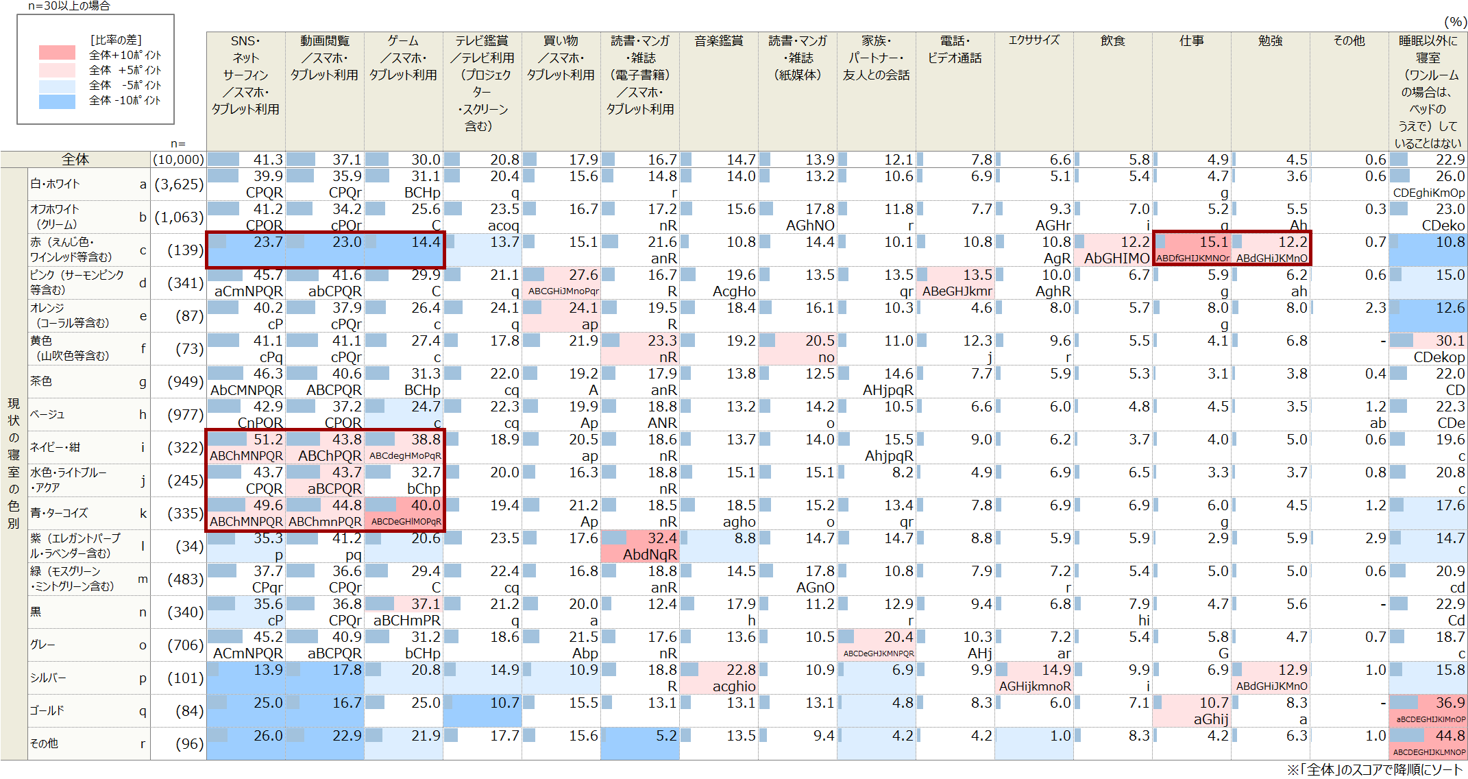 一番、特徴があったのが寝室の色が赤で「仕事」や「勉強」、さらには「飲食」をする割合が他の色よりも高く、全体的で多くの人が行っていたスマホ・タブレットで「SNS・ネットサーフィン」「動画視聴」「ゲーム」などをする割合は低い傾向にありました。