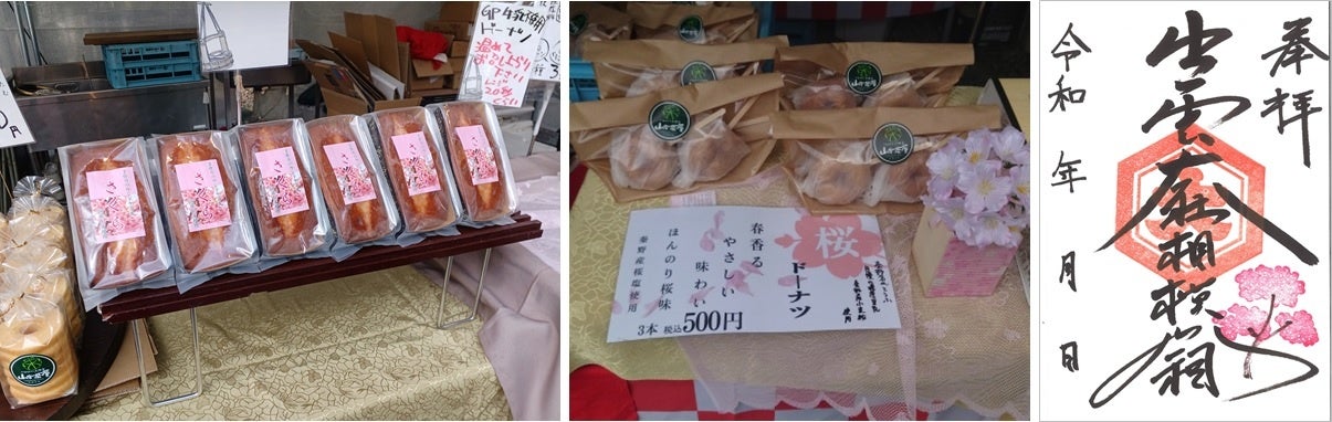 境内では秦野名水仕込みのおいしいお豆腐を手作りする「杜の豆腐工房三河屋」の出張販売も。桜ジェラート・桜パウンドケーキ・桜ドーナツなどこの時期にしかないお土産をご用意しております。