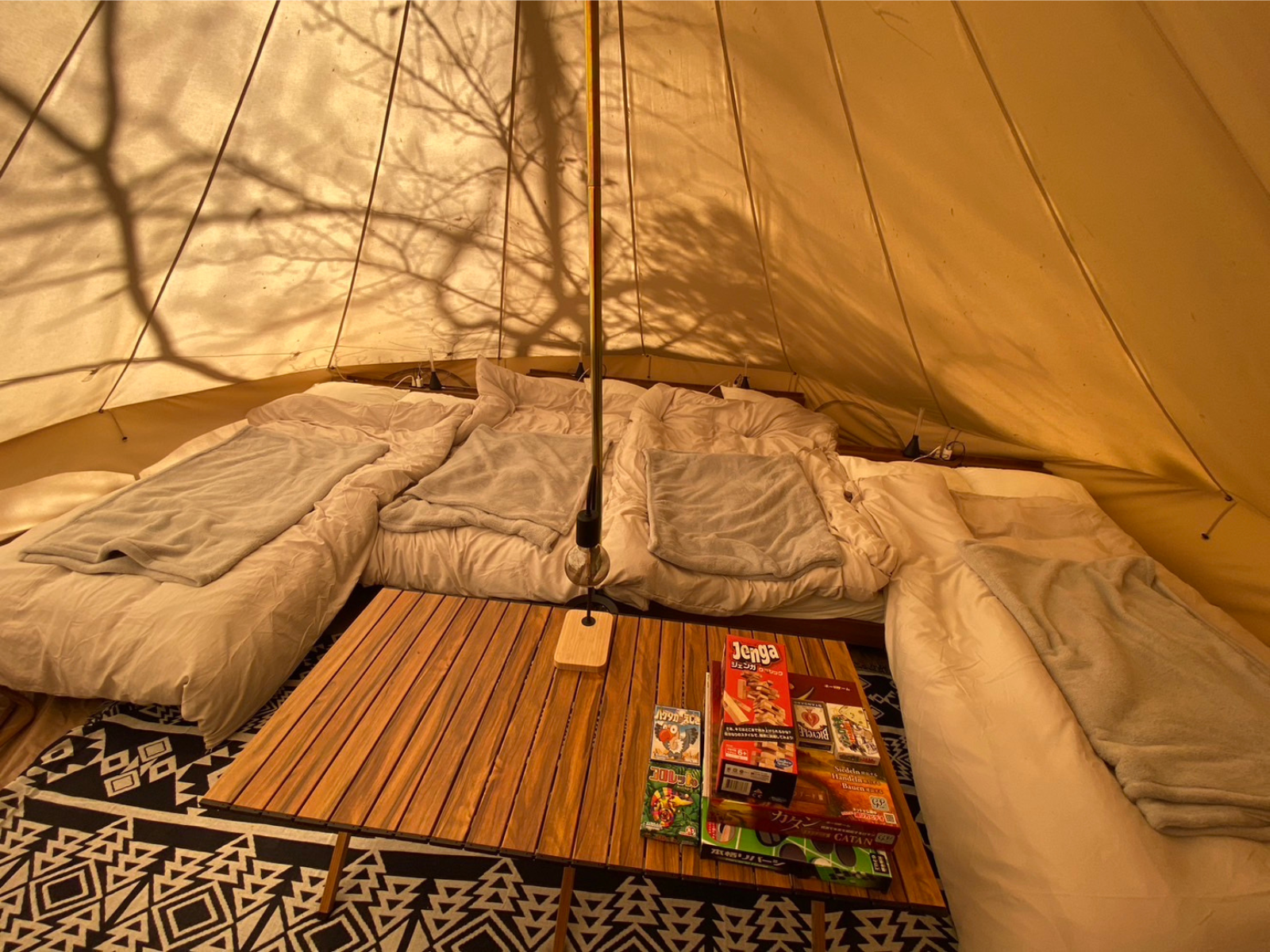 ■直径5mの巨大グランピングテント常設(4ベッドあり)でアウトドア初心者でも安心