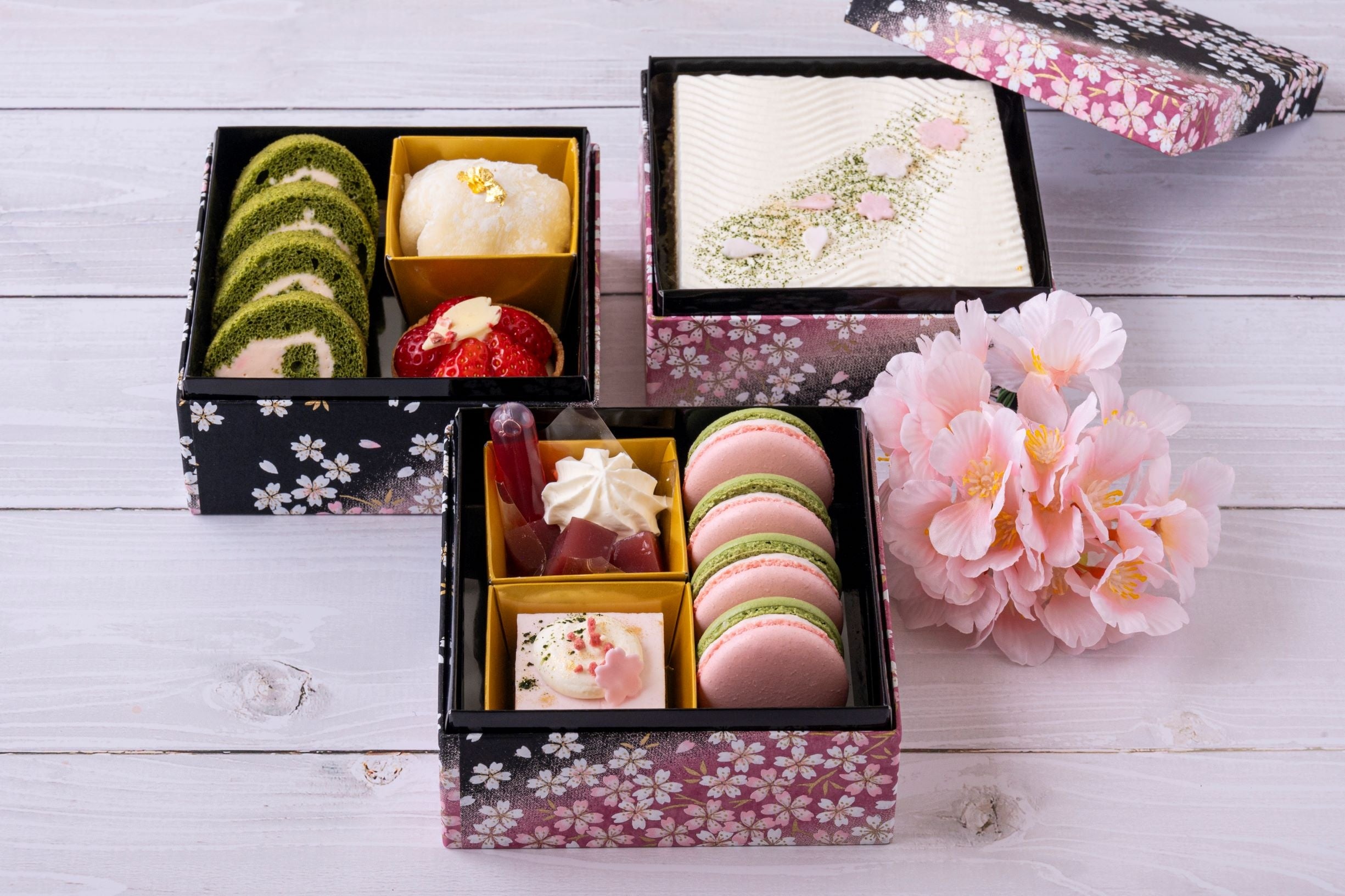 「SWEETS BOX」は“季節の重箱シリーズ”として2021年より定期的に販売をしているテイクアウト商品です。四季やコラボレーションのテーマにあわせ、パティシエの遊び心と旬の食材を取り入れた内容で好評をいただいております。今回のSWEETS BOXはお花見での手土産や春のお祝いのシーンを盛り上げるスイーツであるようにと、日本国内で咲き誇る桜をモチーフにしました。春の香り漂う桜フレーバーのスイーツたちと相性の良い抹茶、旬のイチゴを使った和と洋のお菓子を、桜のデザインをあしらった華やかな3段の重箱に7種類詰め込んでいます。