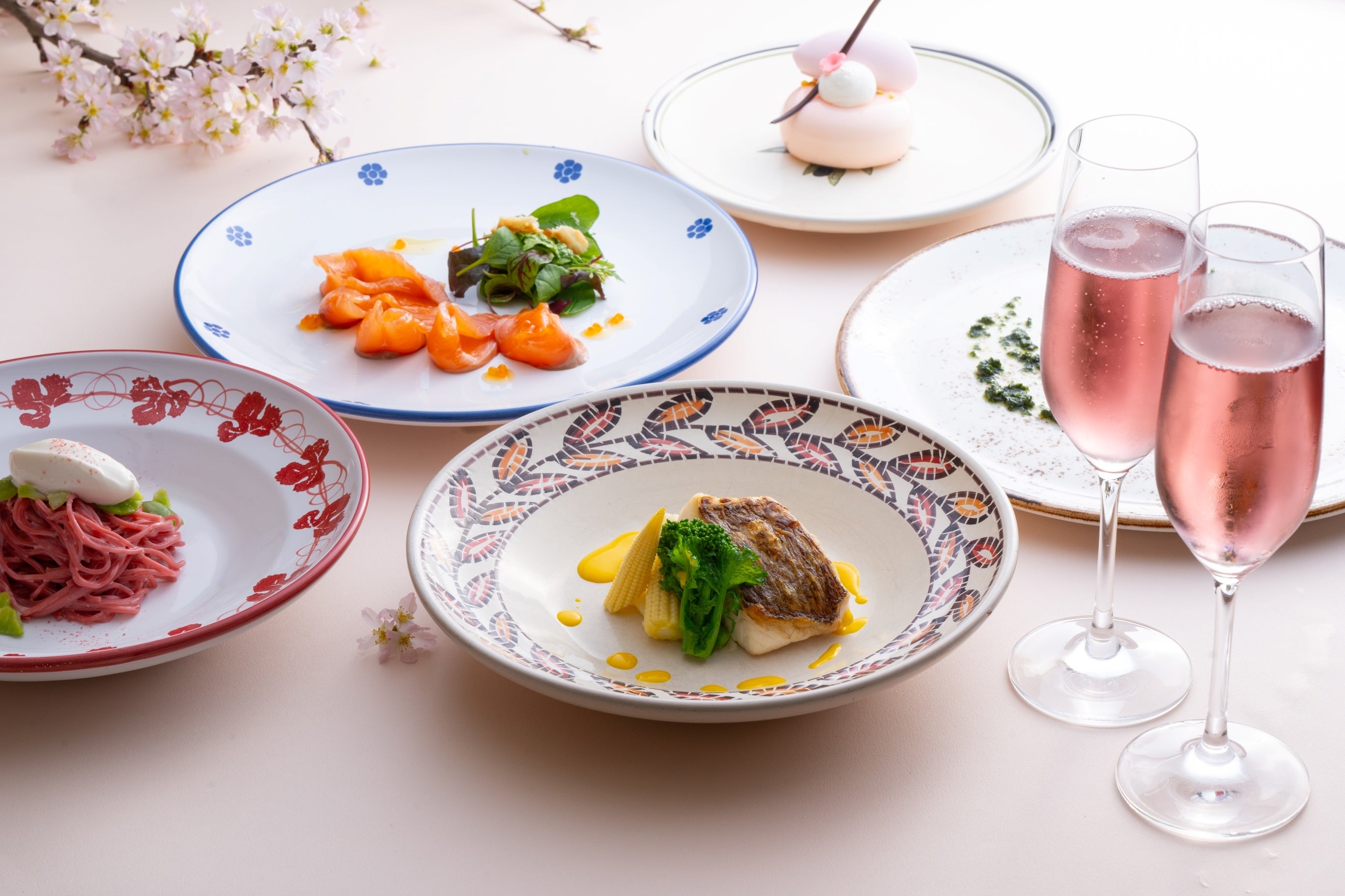 前菜は、桜鱒のマリネを桜ビネガーのビネグレットで。桜鱒の透き通った優しい甘みを、ロゼのスパークリングワインに合わせてどうぞ。パスタは、桜の風味を生かしたピンク色のホームメイドパスタにリコッタチーズのソースを合わせます。メインは、国産牛フィレ肉のローストに桜の葉を刻んで作ったソース、サルサヴェルデを添えて。桜の葉のほのかな苦みに、春の芽吹きを感じる味わいです。デザートは、ペストリーシェフ特製のピスタチオとストロベリーのケーキをご用意しました。