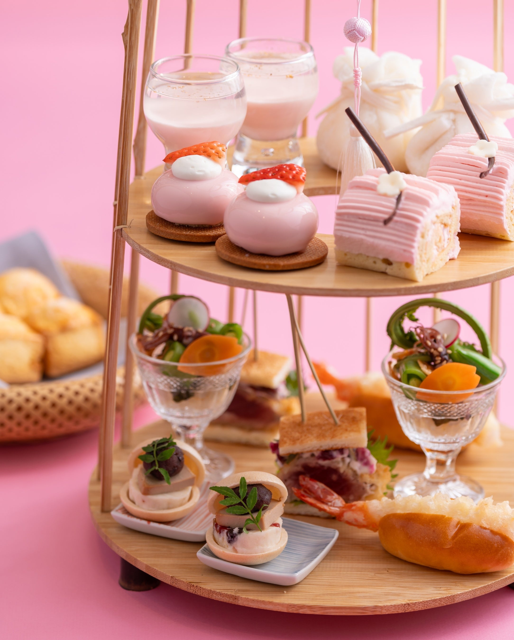 セイボリーは、春野菜のカクテル寿司、ぷりぷりの海老天を自家製バンスで挟んだ海老天婦羅ドッグ、蕗の薹味噌を効かせたフォアグラムースとソイフルーツの最中などをお楽しみいただけます。スイーツには、春色が可憐な桜クリームのロールケーキや苺とカスタードクリームの巾着など、日本茶に合わせて和のテイストを感じさせるスイーツも。甘味には、東山の料理人が作るさくら餅を抹茶と共にご提供します。