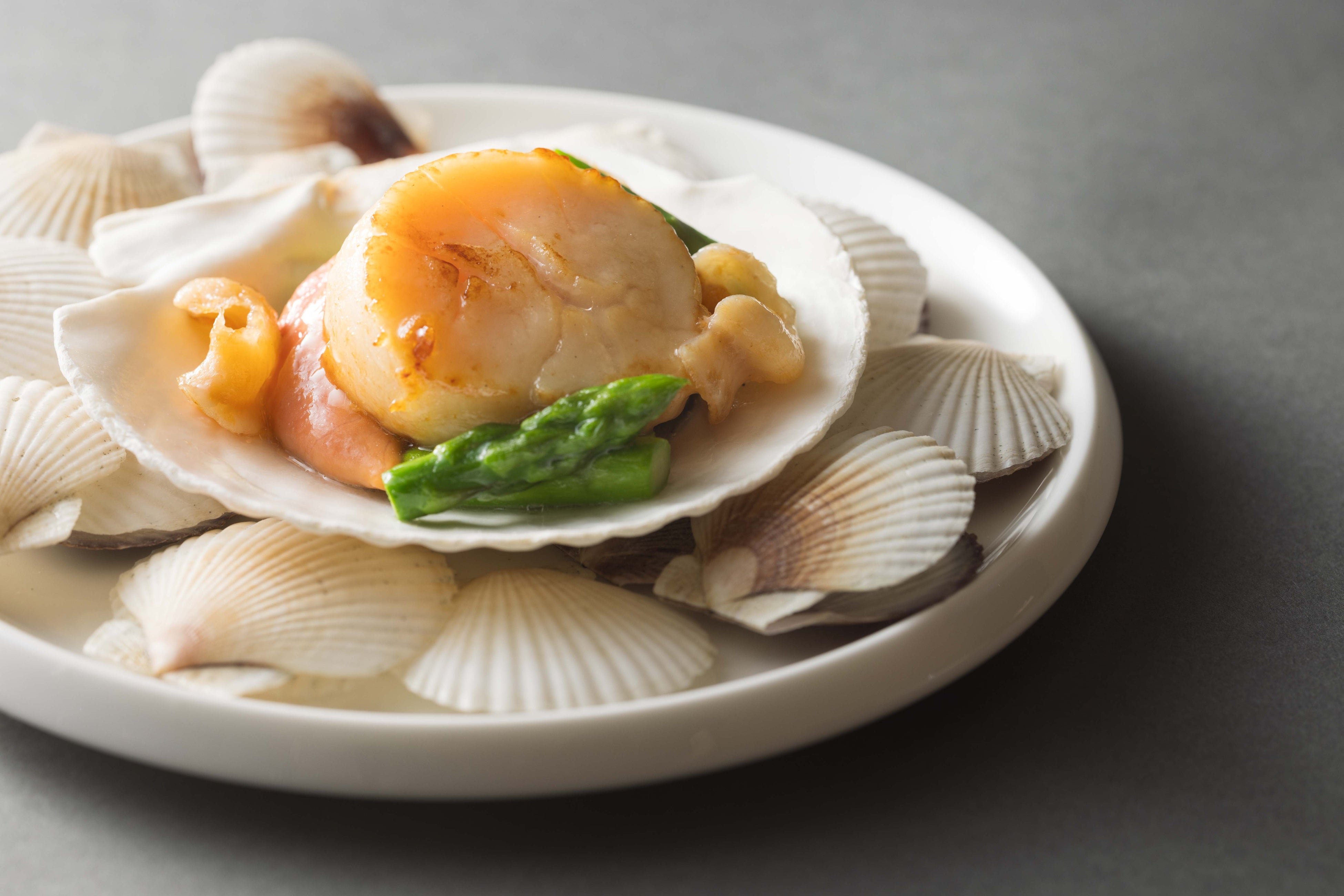 アワビや毛蟹、真ダラなど、函館の朝市で出会った旬の鮮魚は、現地の美味がぎっしり詰まった目にも鮮やかなテリーヌに。噴火湾産の肉厚のホタテ貝は、函館名産の真昆布を有機肥料に使った極上のグリーンアスパラガス “海の神〟とあわせ、函館の海と山の恵みを感じる一皿に仕上げました。北海道産の高品質なブランド肉「ひこま豚」をじっくり丁寧に焼き上げたチャーシューは、七輪で香ばしさをプラスしてご提供いたします。