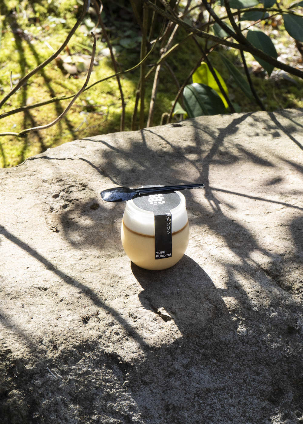 ドリンクと一緒にお召し上がりいただけるのは「湯布プリン」。生クリーム、キャラメルソース、プリンの三層になっており、口当たり滑らかです。また、テリーヌ(抹茶・ほうじ茶)、辰の形をした最中(餡バター・抹茶餡求肥)も提供します。コーヒーとともにスイーツもお楽しみください。