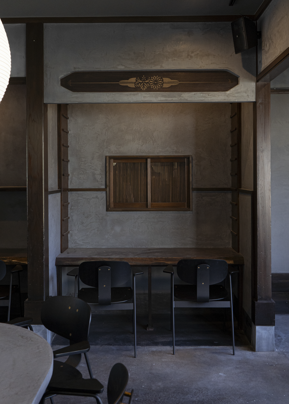 グレーを基調とした店内は、梁や欄間など古民家の良さを残しながらも現代的で洗練されている空間です。ゆったりと過ごせるデスク席や気軽に腰掛けられる席、大きな丸いメインテーブルなど、様々なお席をご用意しており多くの人々が集まって居心地良く過ごせるカフェとなっています。