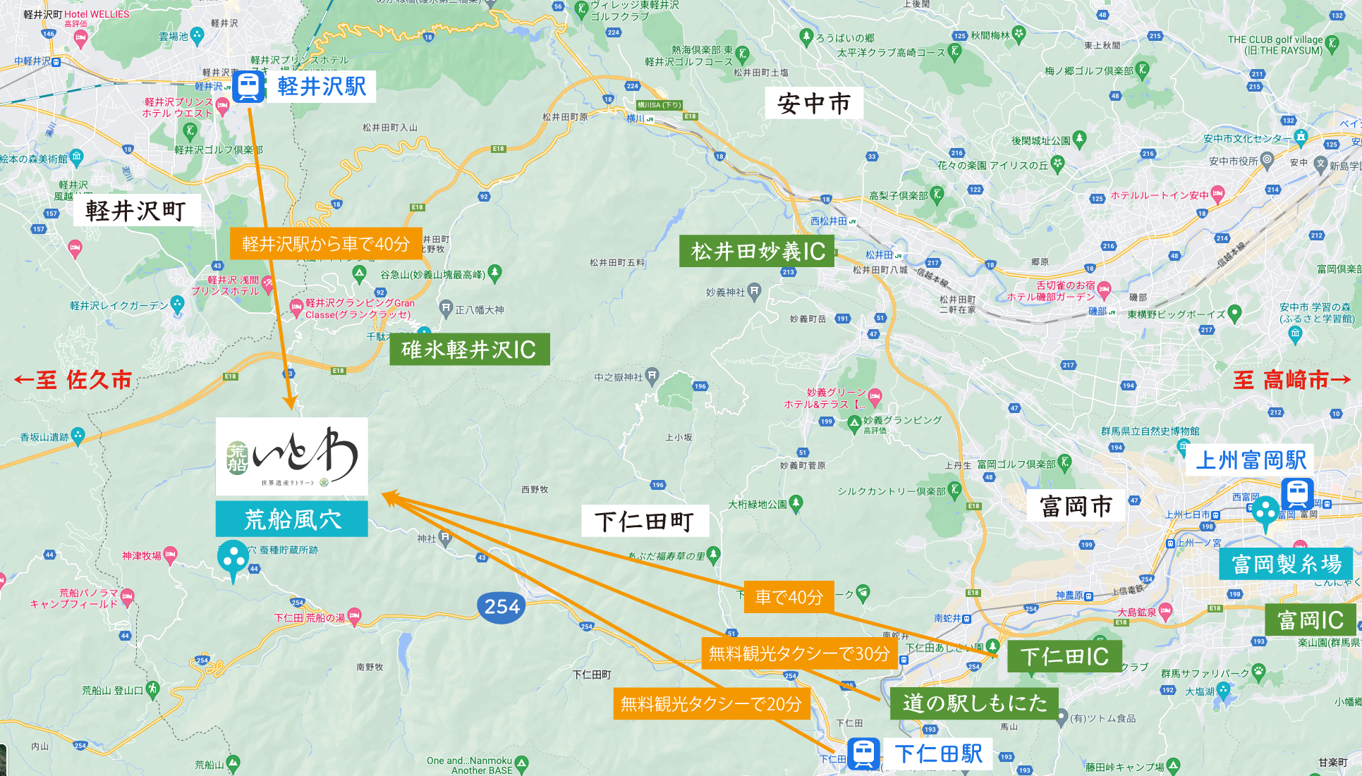 電車: 上野駅から下仁田駅まで110分、下仁田駅からタクシーで30分