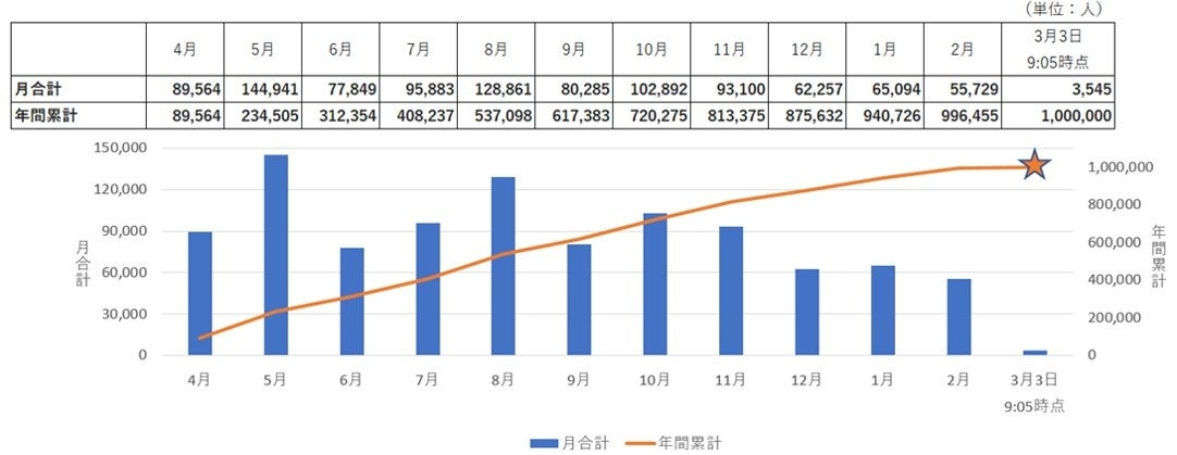 リニューアル前までの最高年間来園者数は、平成31年度の74万人でしたが、リニューアルにより新たに大型アスレチックやジップラインが登場したほか、キャンプ場の拡充や一部エリアで愛犬との入園が可能となったこと、さらには年間を通じて多様なイベントやキャンペーンを実施したことなどにより毎月の来園者数の底上げがなされた結果、年度末までに約1か月を残して当初目標である「年間累計来園者数100万人」を達成しました。
