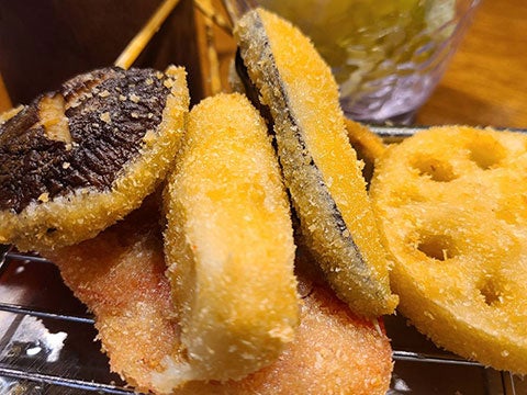 串カツ・サラダ・逸品料理・ご飯もの・デザート等、合計60種類以上が食べ放題。目の前のフライヤーで自分で揚げるスタイルです