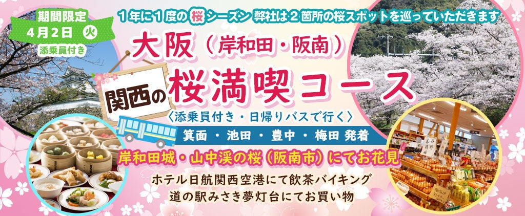 阪急箕面駅東側「みのおサンプラザ」前 7:50集合 8:00出発==阪急池田駅池田市役所前 8:20集合 8:30発==豊中市民会館「市立アクア文化ホール」前 8:50集合 9:00出発==JR大阪駅桜橋口 専門学校HAL大阪前 9:15集合 9:25出発===岸和田城(お花見・見学)10:40頃着/11:30発===ホテル日航関西空港(お食事)12:00頃着/13:30発===山中渓の桜 (お花見) 14:00頃着/14:40出発===道の駅 みさき夢灯台 (買い物) 15:00頃/15:30発===JR大阪駅桜橋口周辺 16:50頃着===豊中市民会館周辺 17:10頃着===阪急池田駅池田市役所周辺17:30頃着 ==阪急箕面駅東側周辺 17:50頃着