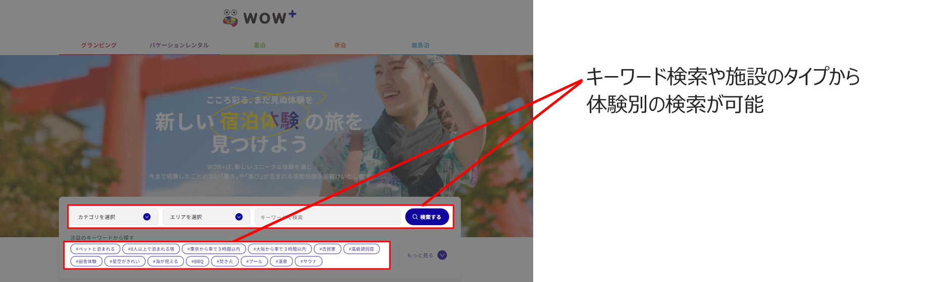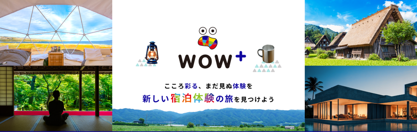 「WOW+」は、“新しい宿泊体験の旅”をコンセプトとした国内宿泊予約サイトで、グランピング施設をはじめ、貸別荘や古民家一棟貸しなどのバケーションレンタル、農業体験を楽しめる農泊施設、お寺の宿坊に滞在できる寺泊施設など、HISが厳選したユニークな宿泊施設に特化したサイトとなっております。掲載する施設を厳選し絞ることで、ユーザーの求める体験から魅力的な施設を検索できます。