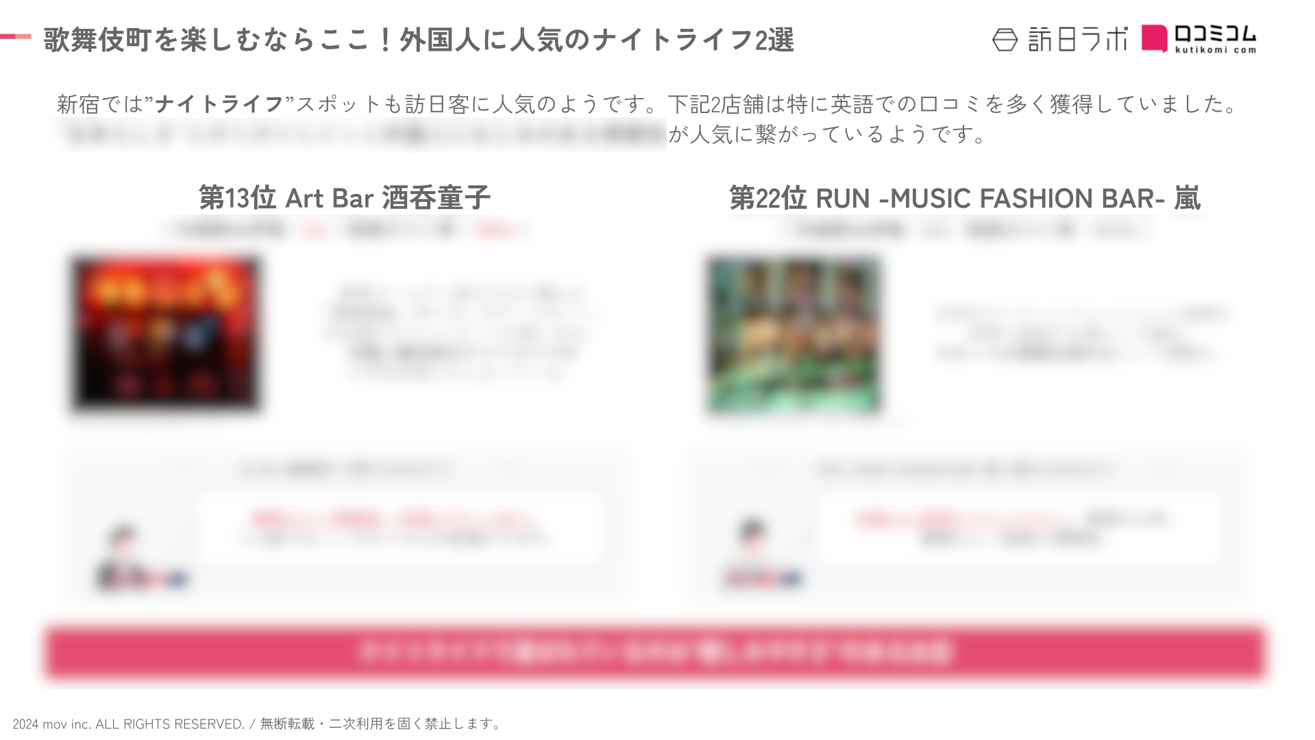 特に英語での口コミを多く獲得していた「Art Bar 酒呑童子」「RUN -MUSIC FASHION BAR- 嵐」は、ある共通点が人気に繋がっているようです。